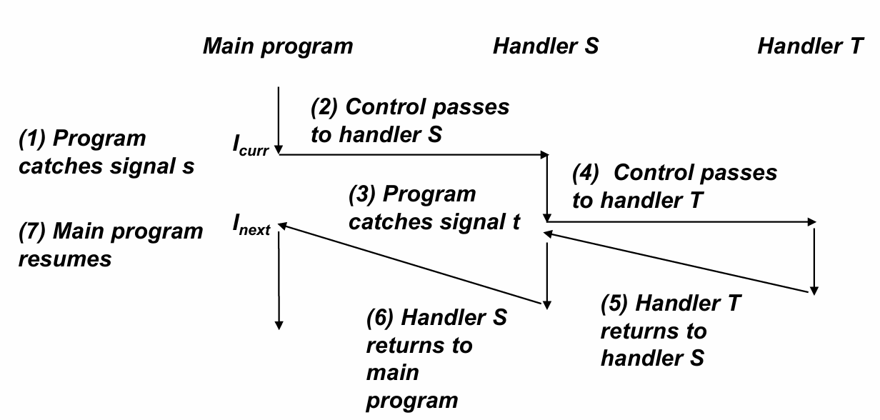 - 多层中断场景:主程序先接收到信号 s,跳转至 Handler S,在 Handler S 执行期间又接收到信号 t,跳转至 Handler T,Handler T 返回后回到 Handler S,Handler S 完成后返回主程序。