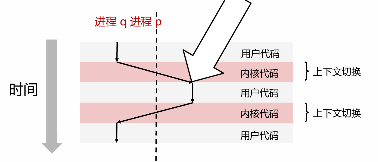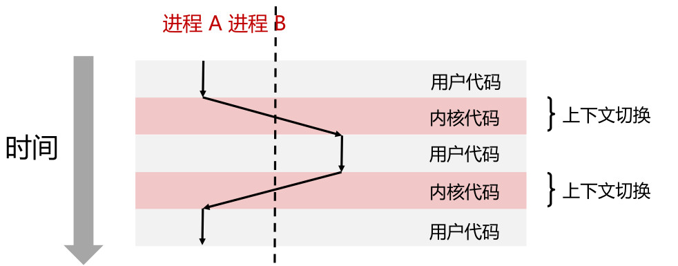 - 执行流程:用户代码 ↔ 内核代码交替出现,上下文切换发生在内核态中。