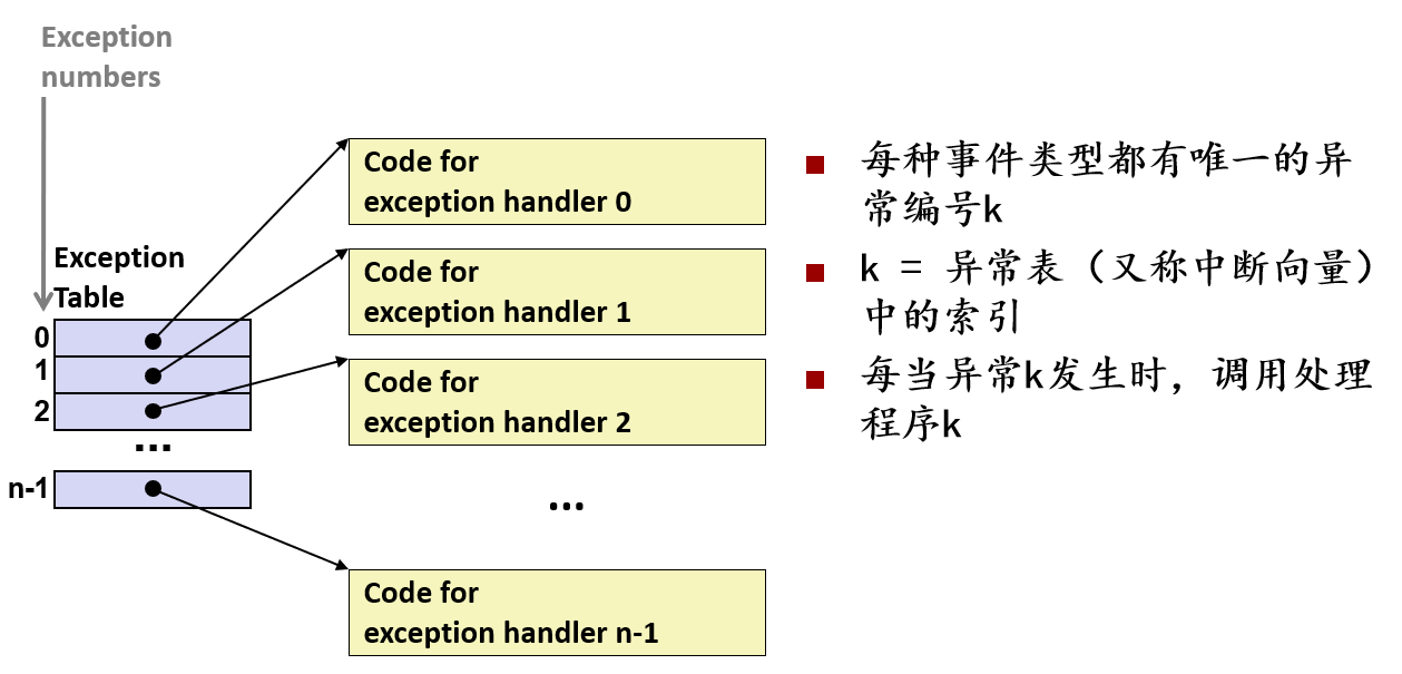 - 改变控制流的机制分为两种:跳转与分支、调用与返回。但是以上的控制流机制难以响应系统级事件,典型的系统事件包括:磁盘或网络数据到达、除零操作、用户输入Ctrl-C,系统定时器超时。因此系统需要异常控制流机制处理部分系统事件。