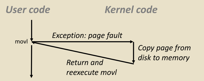 执行流程:用户代码执行movl指令,触发页面错误异常,内核处理程序将页面从磁盘加载到内存,返回并重新执行原movl指令。