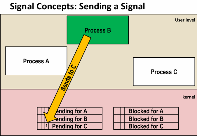 kill()请求发送信号。 - 系统模型:多个用户级进程(A、B、C),内核维护每个进程的信号状态。