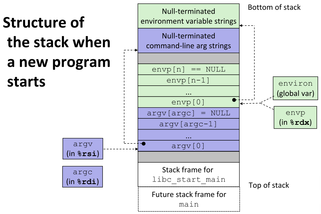 argc(传入%rdi)argv指针数组(传入%rsi),末尾为NULLenvp指针数组(传入%rdx),末尾为NULL- 空终止的命令行参数字符串