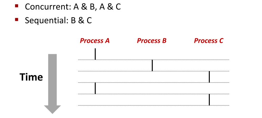 - 进程并发:若两个进程的控制流在时间上有重叠,则称其为并发,否则为顺序执行。