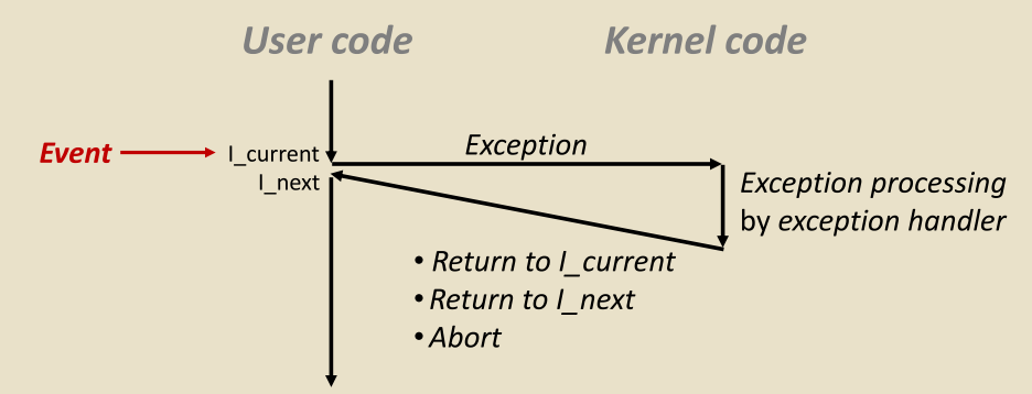 - 异常是处理器因某种事件触发而将控制权转移到操作系统内核的过程。