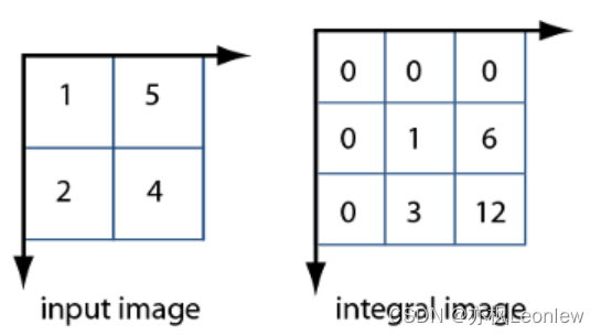 (x,y),积分图像对应位置的值是原始图像左上角到(x,y)的所有像素的和。