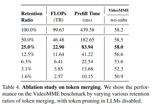 Token Merging 的比例。在进入 LLM 之前进行 Token 合并,测试了不同的保留比例(Retention Ratio)。75% 的视觉Token都是冗余的。