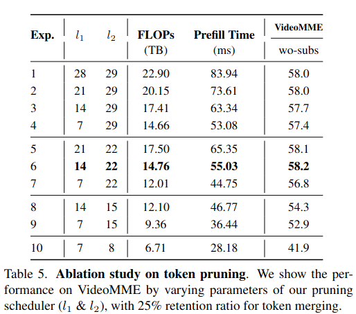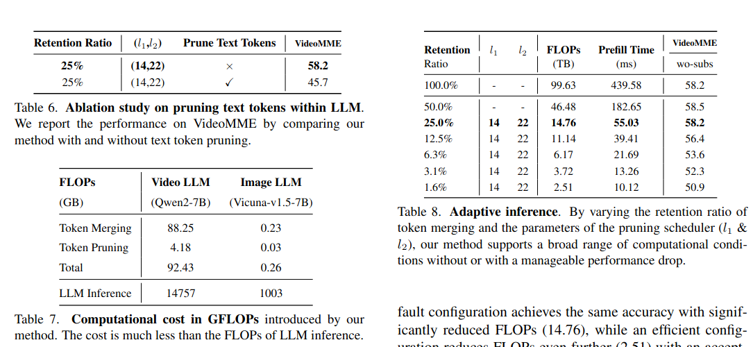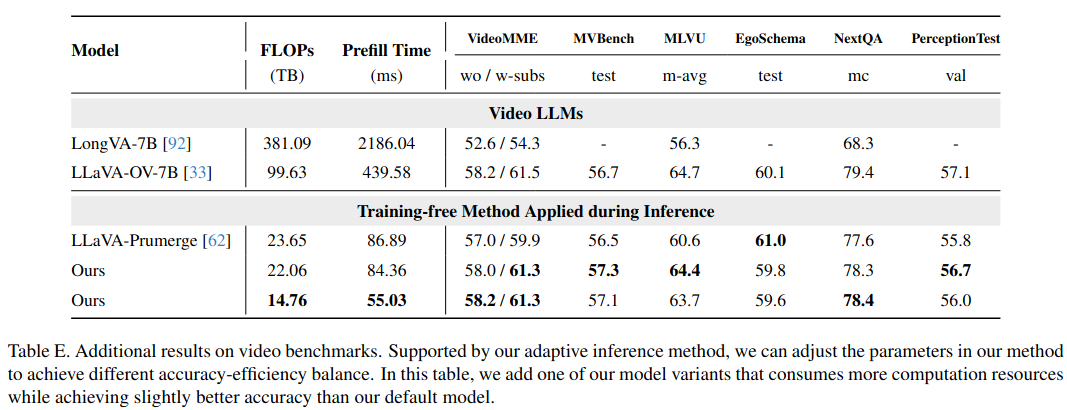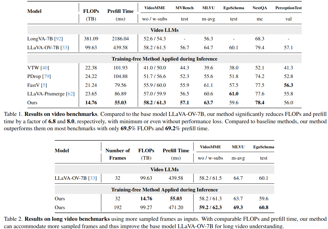 通常加速意味着性能下降。但在视频理解中,Token压缩得足够小(FLOPs降低6.8倍)可以在同样的计算预算下,输入更多的视频帧。计算量每增加,但是性能提升。视频理解的瓶颈往往在于帧数太少丢失了时间信息,而不是单帧内的Token不够多。