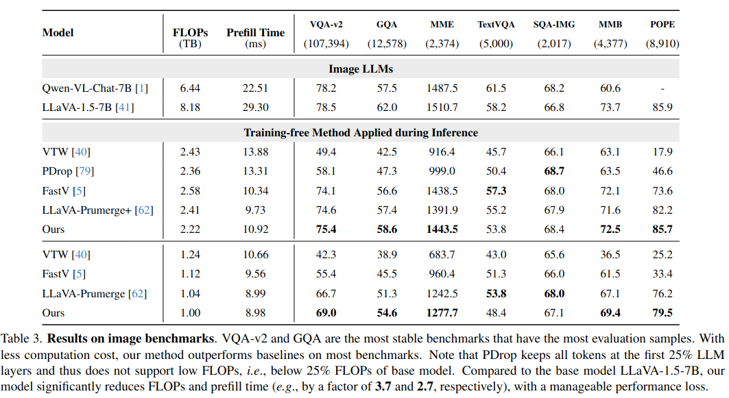 在图像任务上,约 3.7倍 的 FLOPs 降低,同时在 VQA-v2, GQA 等榜单上保持了极具竞争力的性能 。