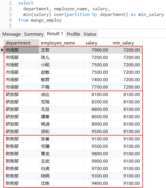 查找每个部门下员工薪水的最小值: