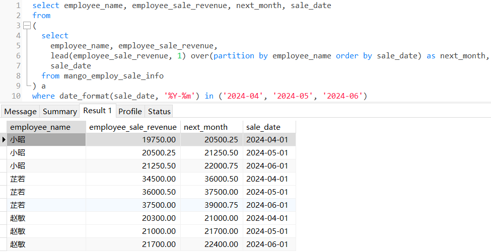 查询三位员工2024年第二季度的当前月和下一个月的数据对比: