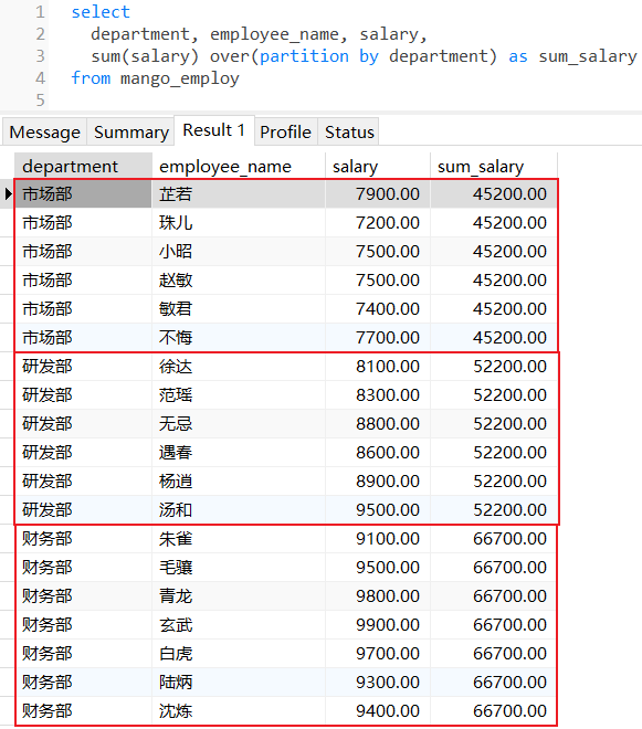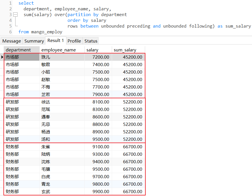 计算每个部门下所有员工薪水总和,并且每个部门员工薪水升序排序: