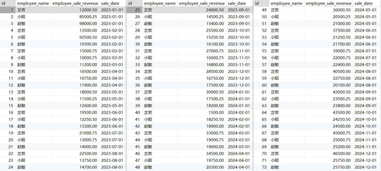 创建一张数据表,表里面有三位员工从2023年1月份到2024年12月份的销售额,进行跨行函数演示: