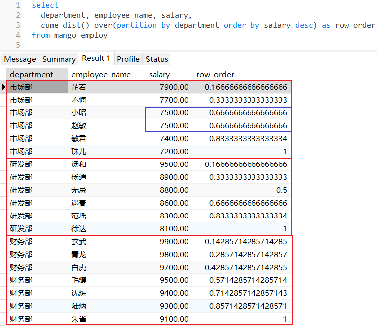 cume_dist():计算当前行值在排序完成的分区范围内累积分布概率,即大于等于或是小于等于当前值的行数占比,相同值的行会得到相同的累积分布值;
