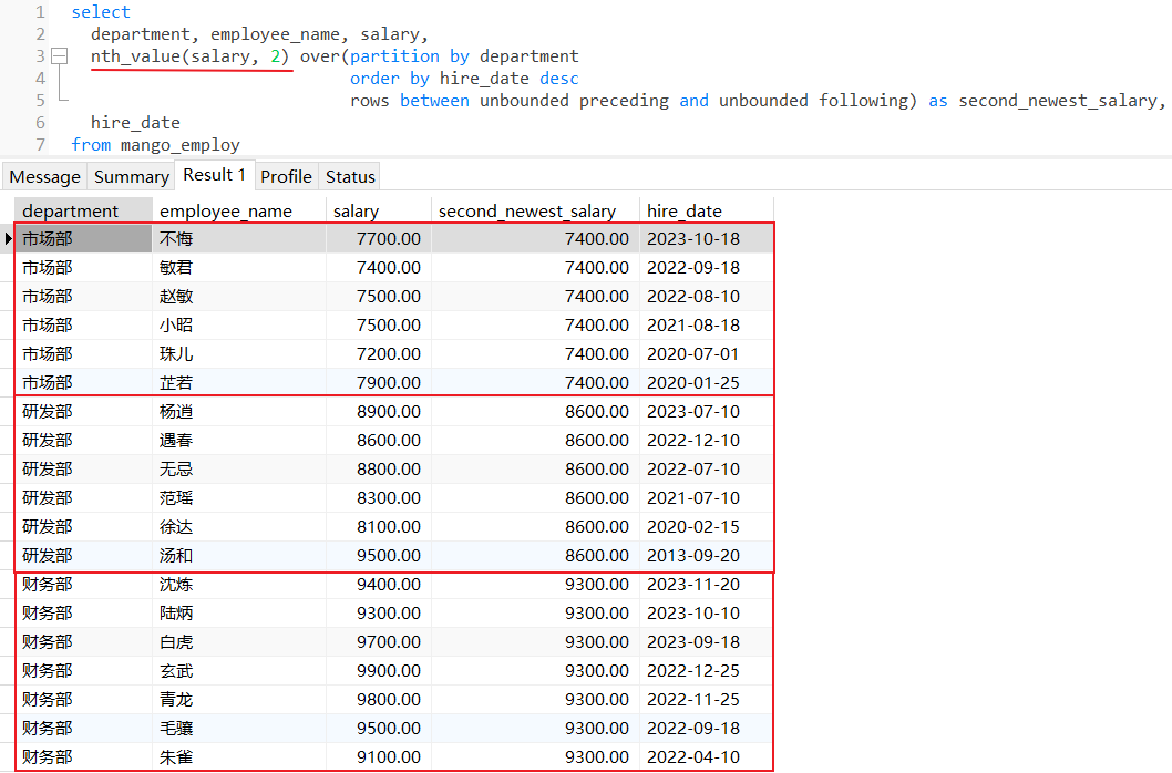 nth_value():返回滑动窗口范围内排序后的第N行对应字段的值,如果不写rows子句,那么默认是整个分区范围,如果写了rows子句,那么是滑动窗口范围;