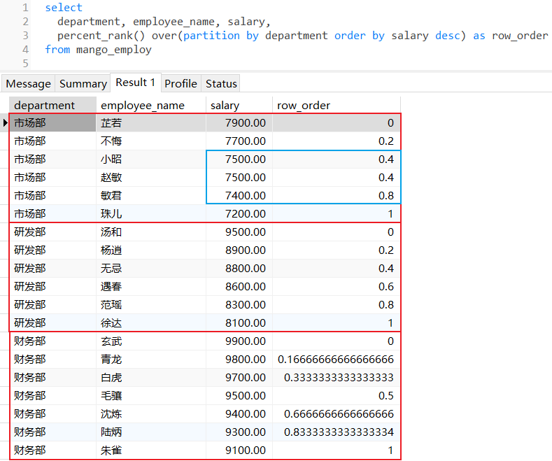 percent_rank():用于计算数据在分组内的百分比排名,结果显示当前行在排序后的相对位置,如果存在名次相同的数据,那么后续排名将会产生跳跃,函数返回值是在0.0到1.0之间的double类型数据,计算公式当前行(rank-1)除以(分区总行数-1),如果当前分区只有一行数据时,那么结果返回0.0;