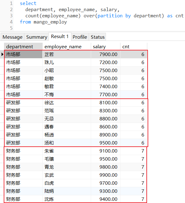 统计每个部门下员工的数量: