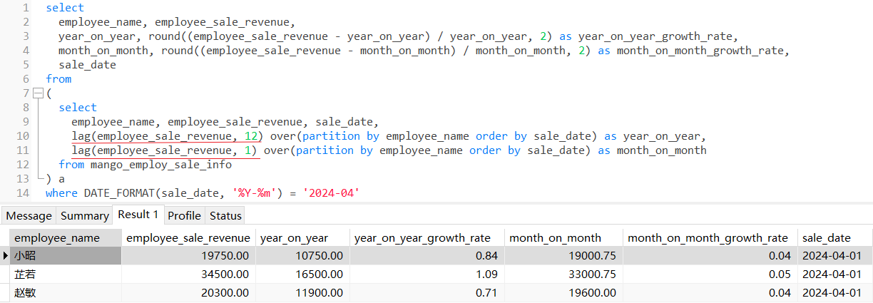 lag():返回分区范围内当前行之前的第n行数据,不需要写rows子句,不支持滑动窗口,是以整个分区作为分析的窗口;