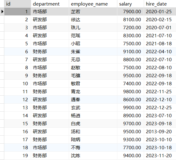 所有基础统计函数都会忽略null值,除了count(*)基础统计函数会统计所有行数据,模拟一张数据表进行演示: