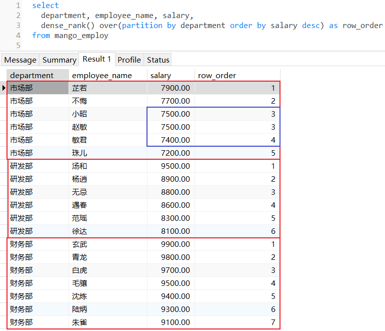 dense_rank():为分区范围的每行数据都分配一个序列号,返回当前行在分区中的名次,如果有名次相同的数据,那么后续的排名也是连续值;