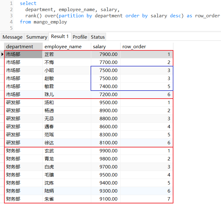 rank():为分区范围的每行数据都分配一个序列号,返回当前行在分区中的名次,如果有名次相同的数据,那么后续的排名将会产生跳跃;