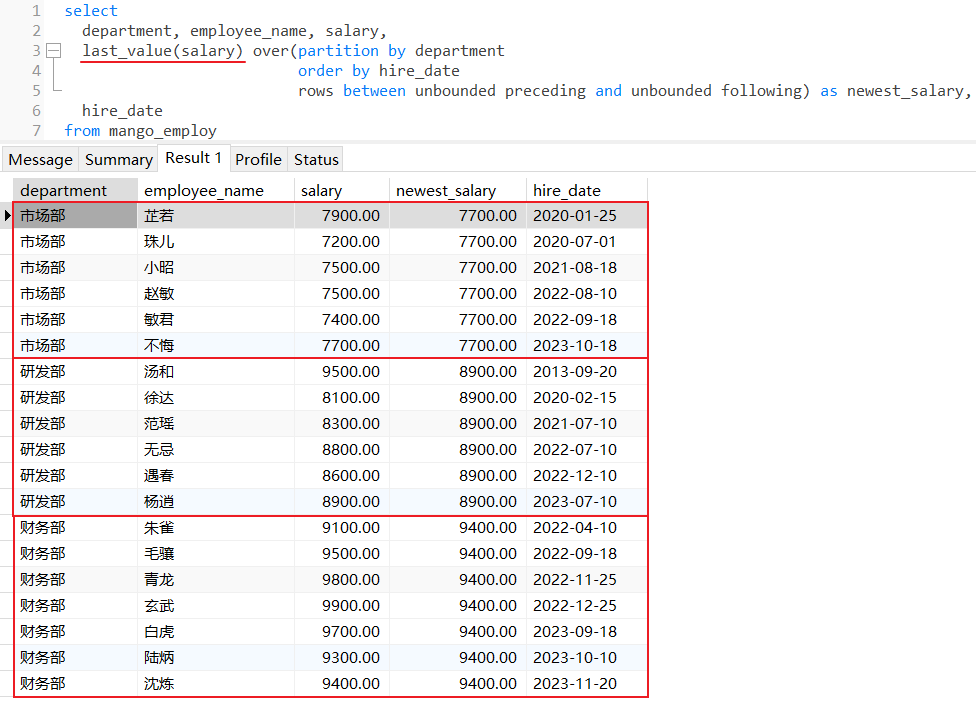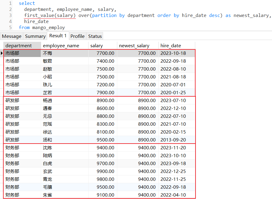first_value():返回滑动窗口范围内排序后的第一行对应字段的值,如果不写rows子句,那么默认是整个分区范围,如果写了rows子句,那么是滑动窗口范围;