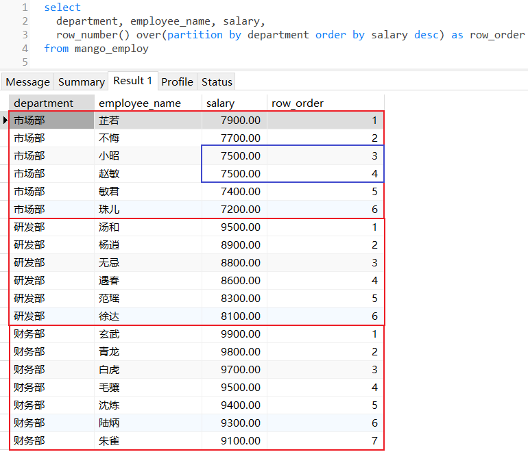 row_number():为分区范围的每行数据都分配一个序列号,序列号从1开始,没有序号重复和跳跃;