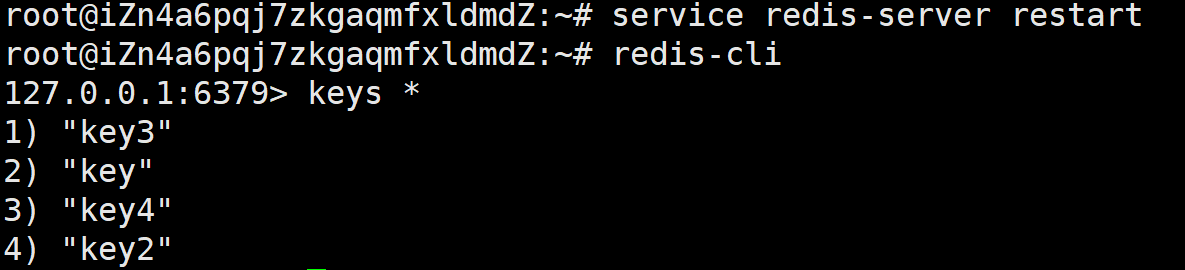 此时我们退出客户端,重新启动redis服务,再进入客户端,发现key4竟然还是保存的