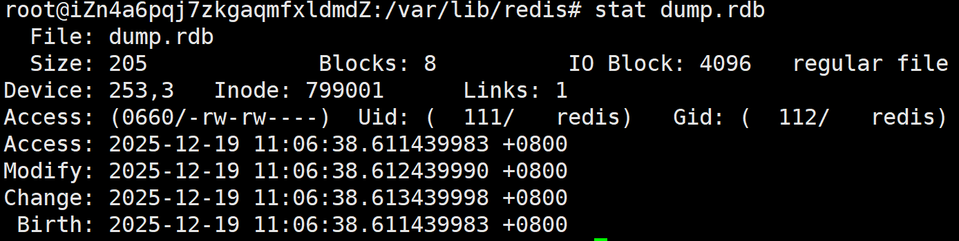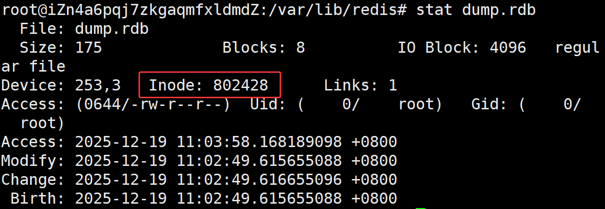 可以看到dump.rdb的详情信息,他的inode此时是802428,和之前相同,可见并没有把我们直接设置的键值对储存起来,这是因为我们还没有满足自动触发rdb的条件