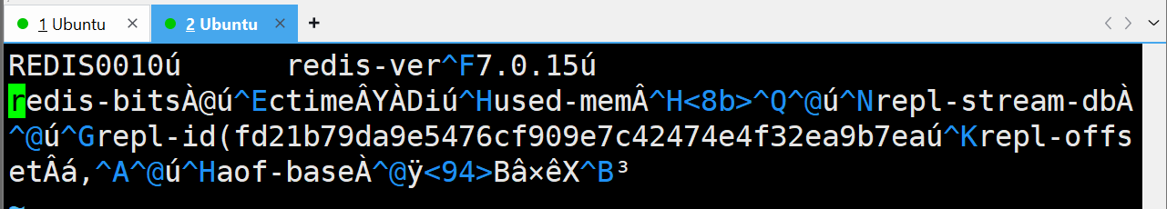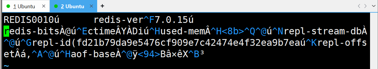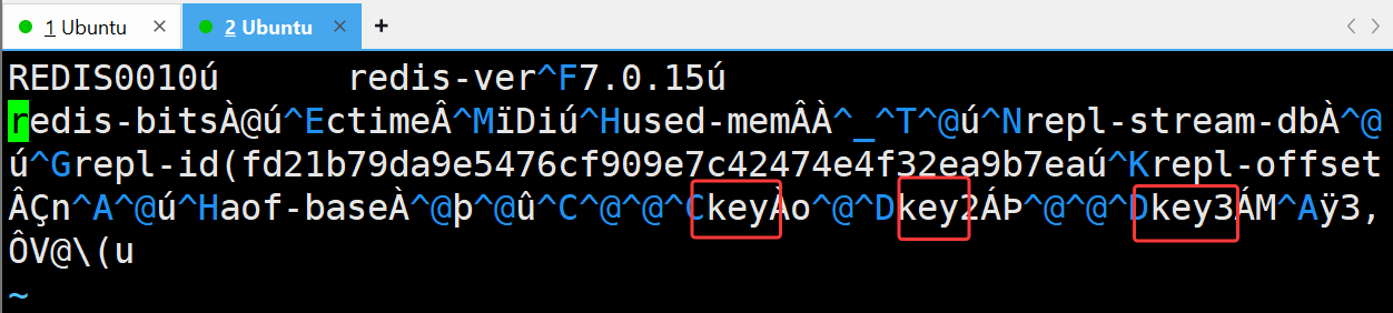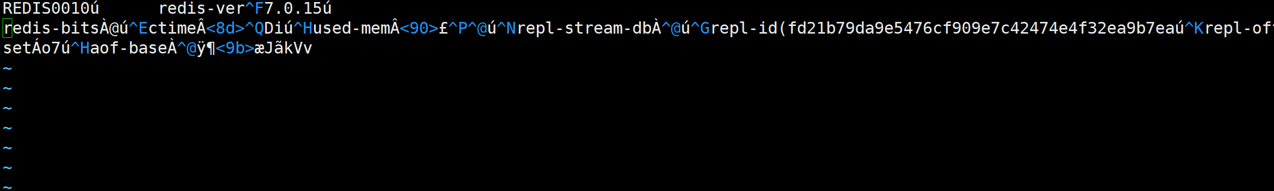 我们进入快照文件查看,这个rdb文件是一个二进制文件,内存中的数据以二进制的形式保存到这个文件中,redis重启的时候就会去读取这个文件,从而恢复内存中的数据,如果我们对这个文件进行了修改,redis服务可能就无法启动了