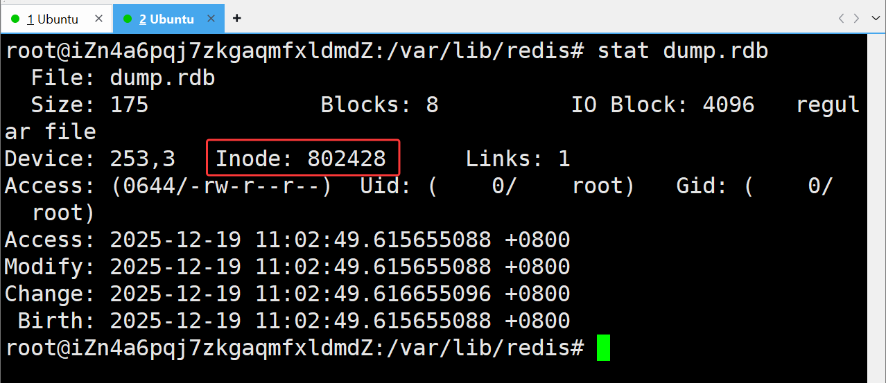 再去查看一下快照文件的信息,发现inode已经和之前不同了,说明确实进行了快照文件的替换