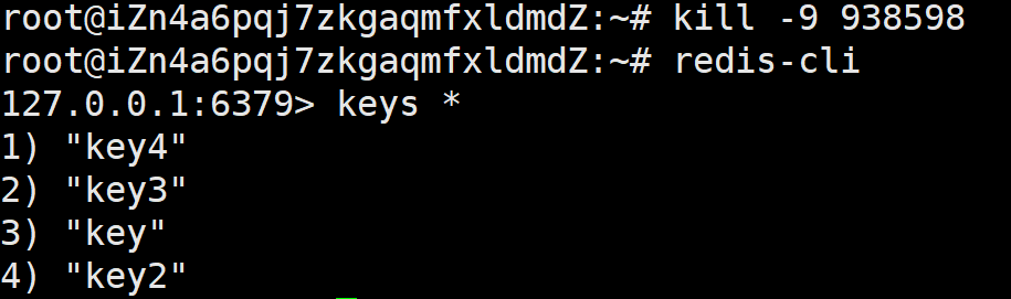 直接使用kill -9命令删除进程,这样属于非正常关闭,我们再进入redis客户端,发现key5并没有存储成功