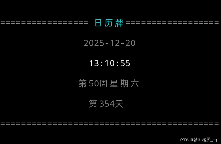需要时间功能 使用场景? 快速检查/脚本/受限环境 选择 Linux date 优点: 极速, 零依赖 示例: 一行命令搞定 终端美化/演示/扩展需求 选择 Python datetime 优点: 美观, 可扩展 示例: 20行精美日历牌 核心智慧: 工具适配情境