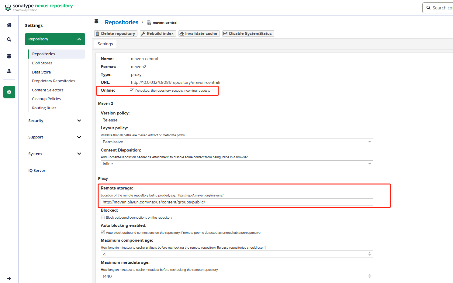 改为阿里云nexus地址(作为代理):http://maven.aliyun.com/nexus/content/groups/public/,最后点击保存