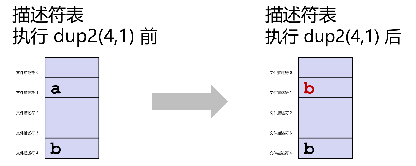 - 调用 dup2(4,1):使 fd=1(stdout)指向 fd=4 所指向的磁盘文件,实现 stdout 输出重定向至指定文件,两个描述符指向同一打开文件表项,共享文件位置。