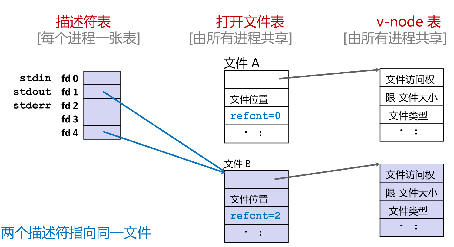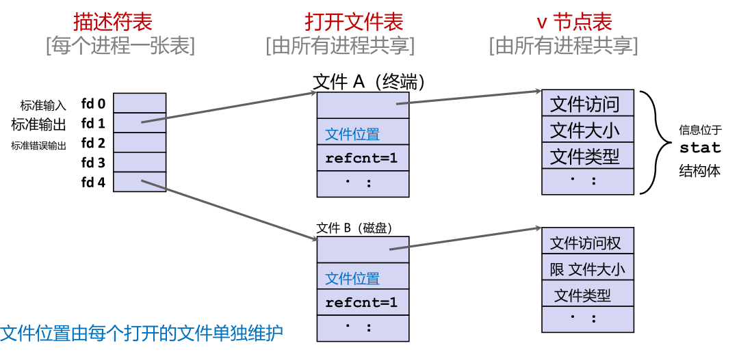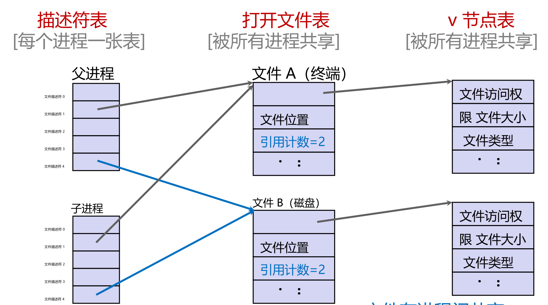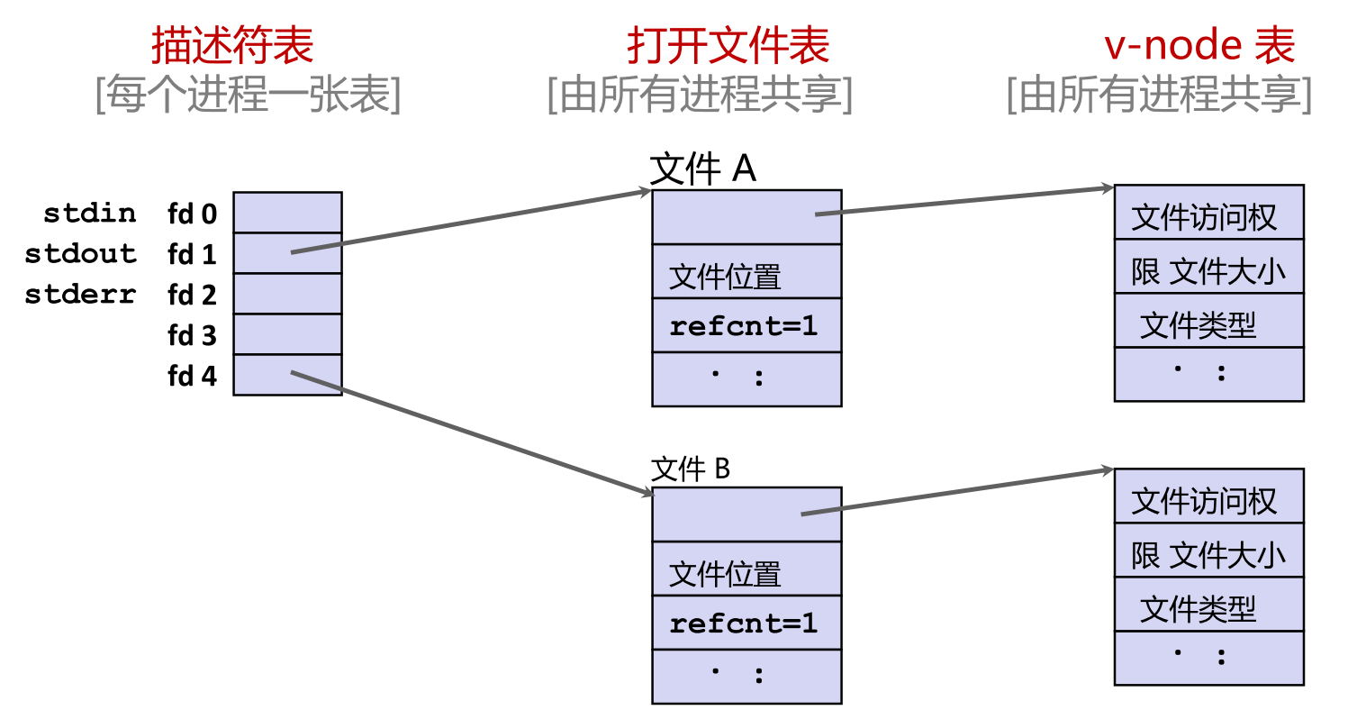 - 每个进程拥有独立的描述符表,所有进程共享打开文件表和 v-node 表。