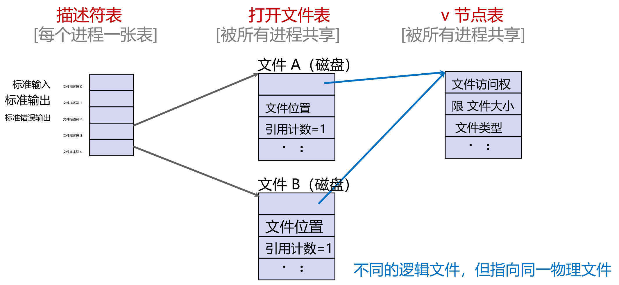 - 多描述符共享同一物理文件:调用 open 两次使用相同文件名可创建两个独立的打开文件表项,逻辑上不同但指向同一物理文件,各自维护独立的文件位置。