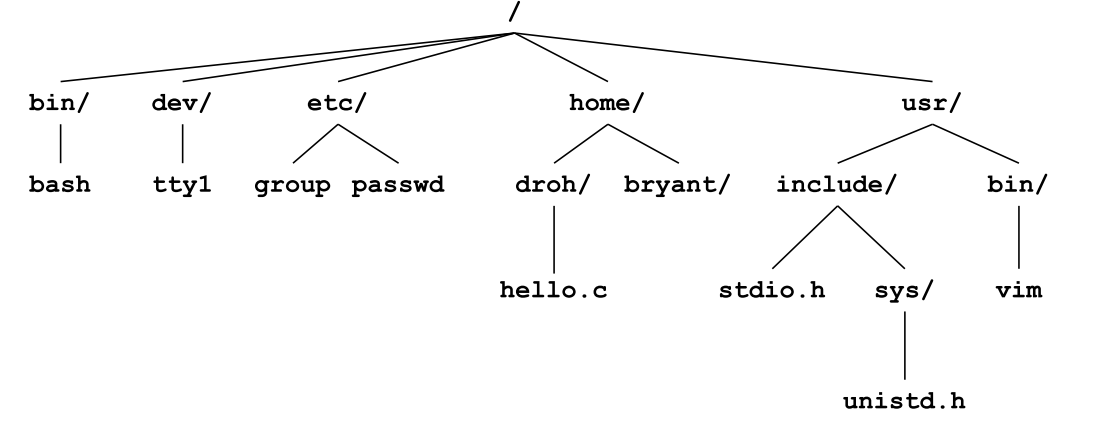 /为锚点的树形结构。如/home/droh/hello.c、/usr/include/stdio.h - 每个进程维护当前工作目录(cwd),可通过