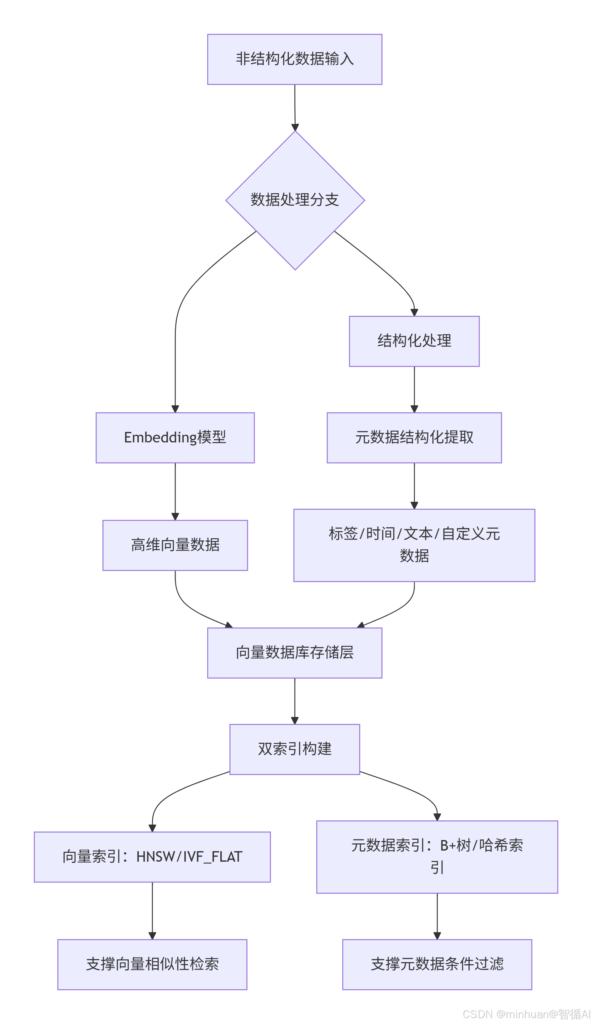 - 存储层同时存储向量数据和元数据,并分别构建专用索引:
