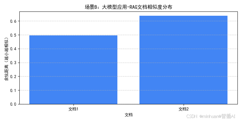 - **场景 B:**先检索到 5 篇与 "大模型落地应用" 相似的文档,过滤后仅保留doc1和doc5(标签为 RAG),可视化图表清晰展示两者的相似度差异;