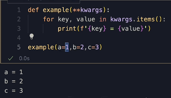 因为有**,所以这个 kwargs 它会是一个字典,然后在函数中遍历还能输出打包后的 kwargs并打印出来。