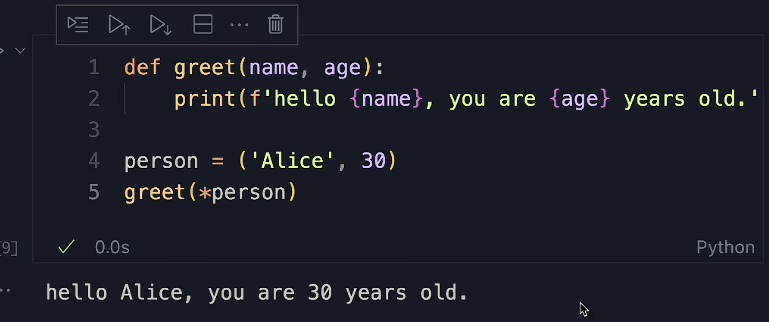 例子1:一个星号可以解包序列,这样一个序列解包为若干个 items,通过这一点我们可以在传参给函数时传入一个带星号的列表来达到传入多个参数的目的。
