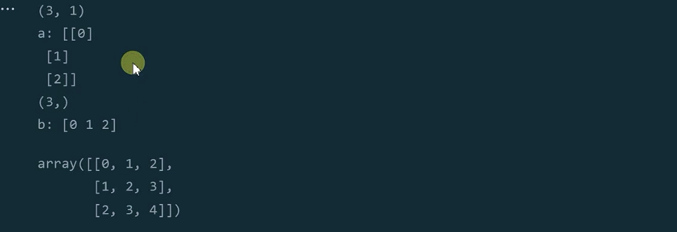 a是四行三列的数组,b是一行三列的一维数组。b的维度小,运算过程中,b在零轴上作了广播。