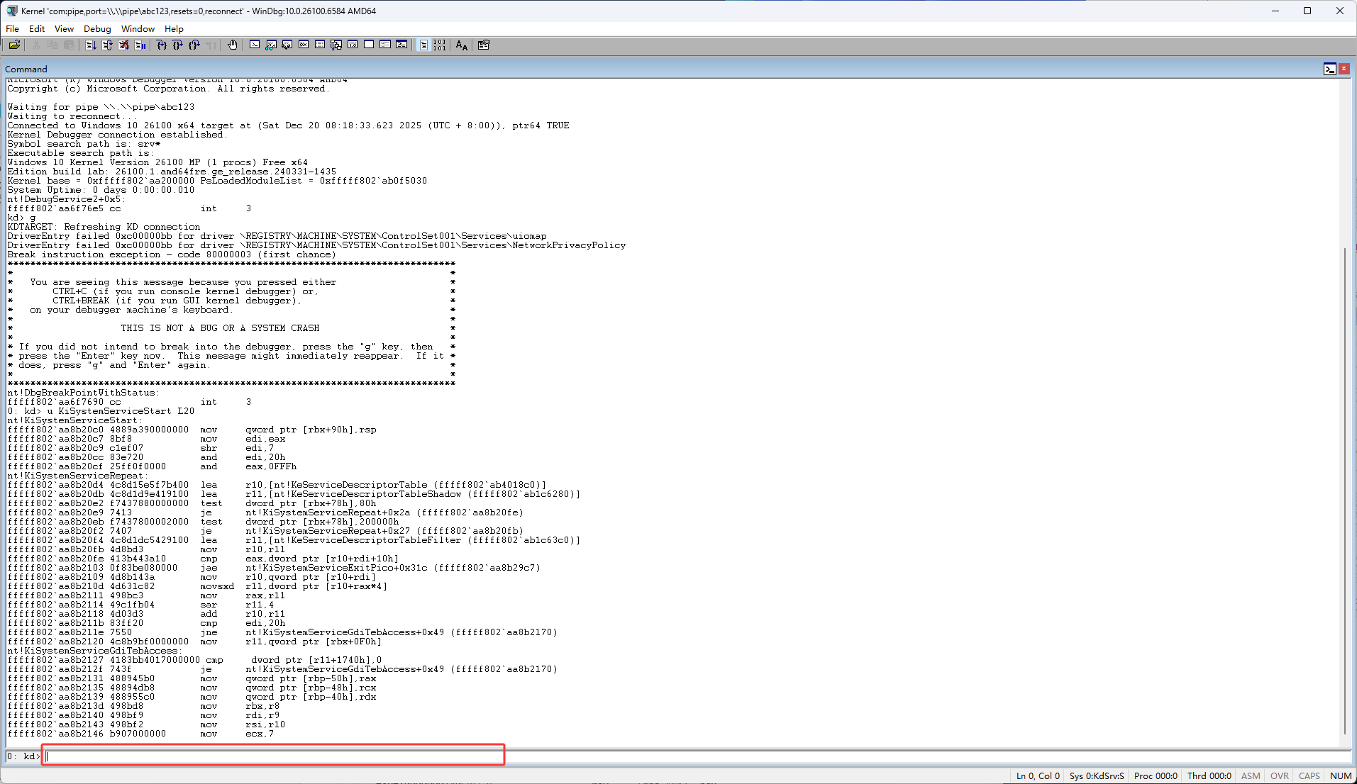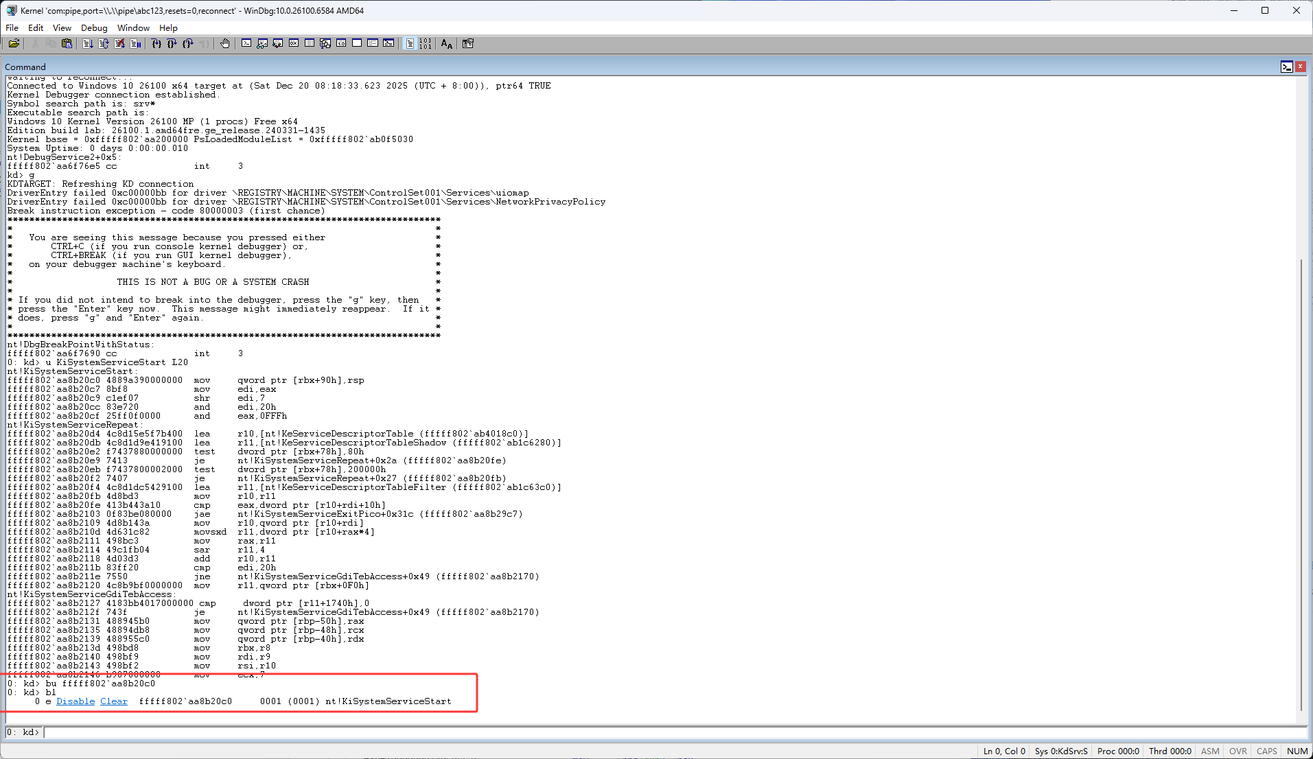 然后输入g让操作系统跑起来,然后等待断到KiSystemServiceStart函数上