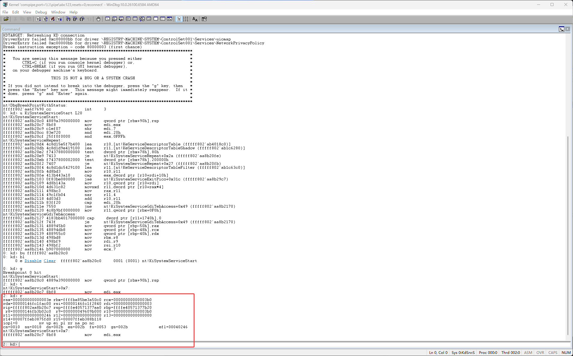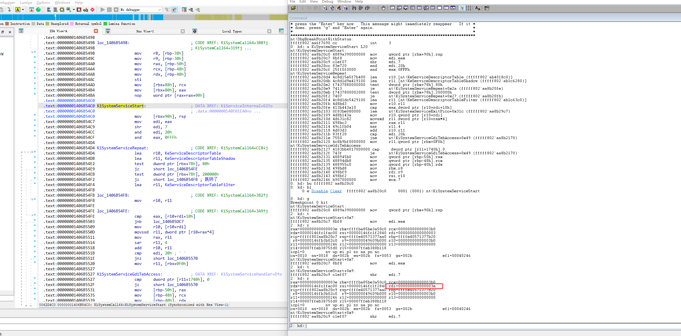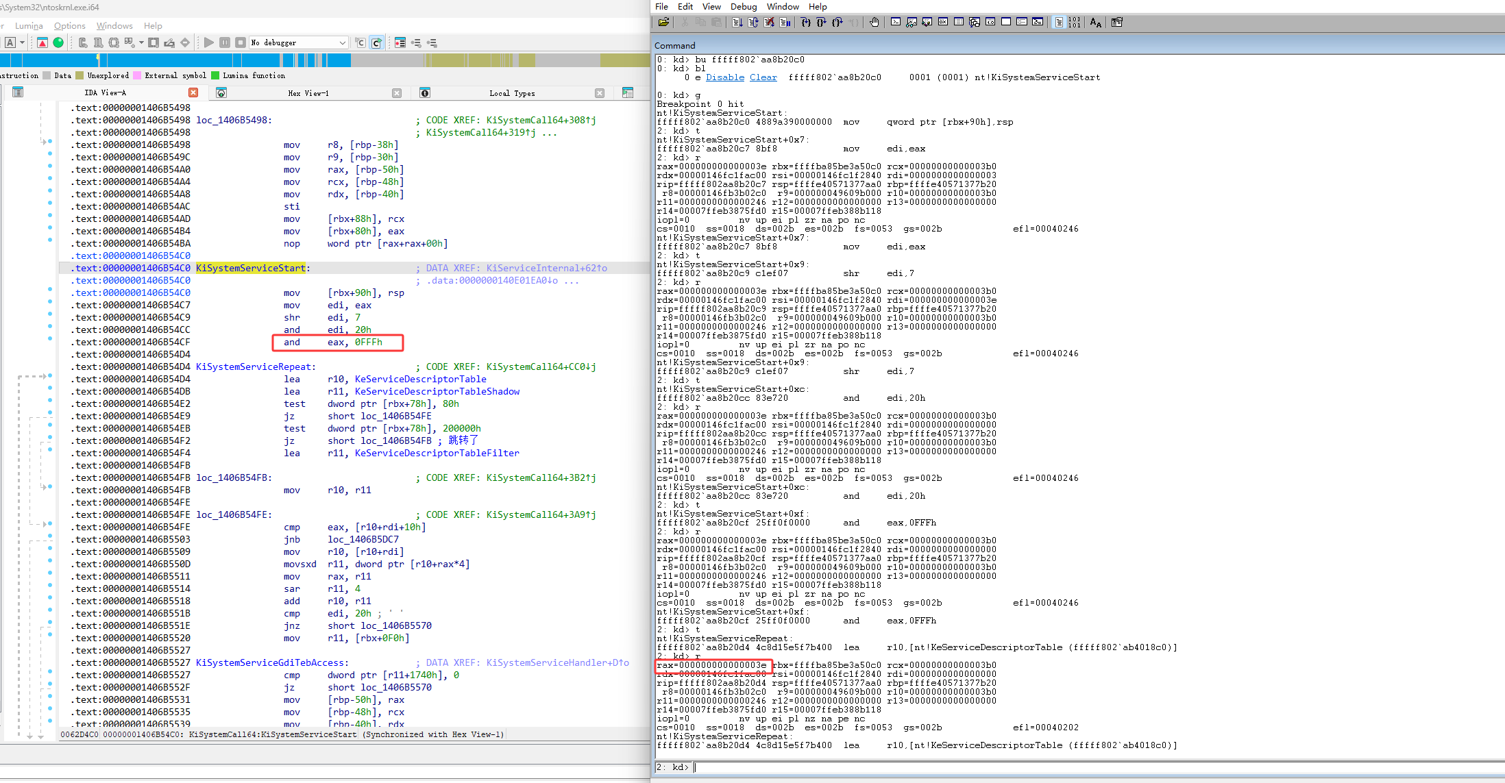 首先使用Windbg来到下图红框的函数,KiSystemServiceStart