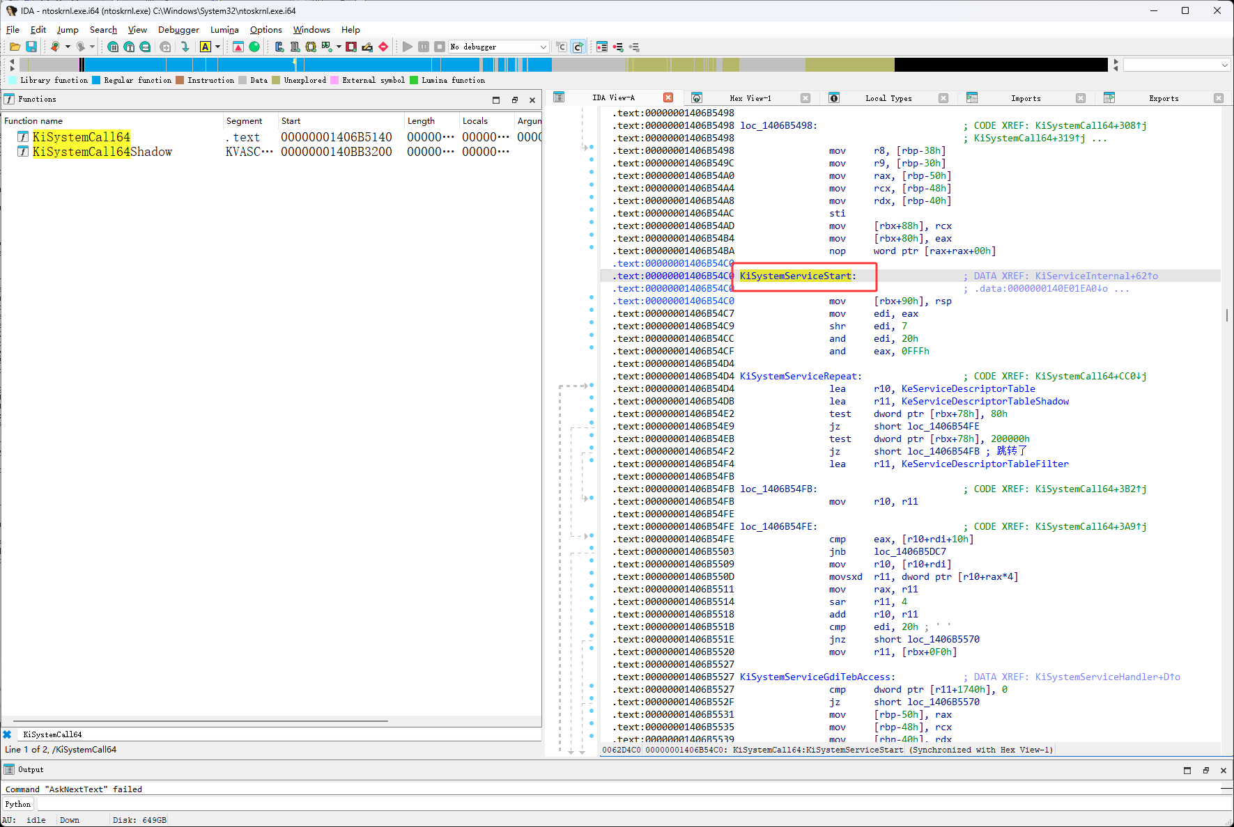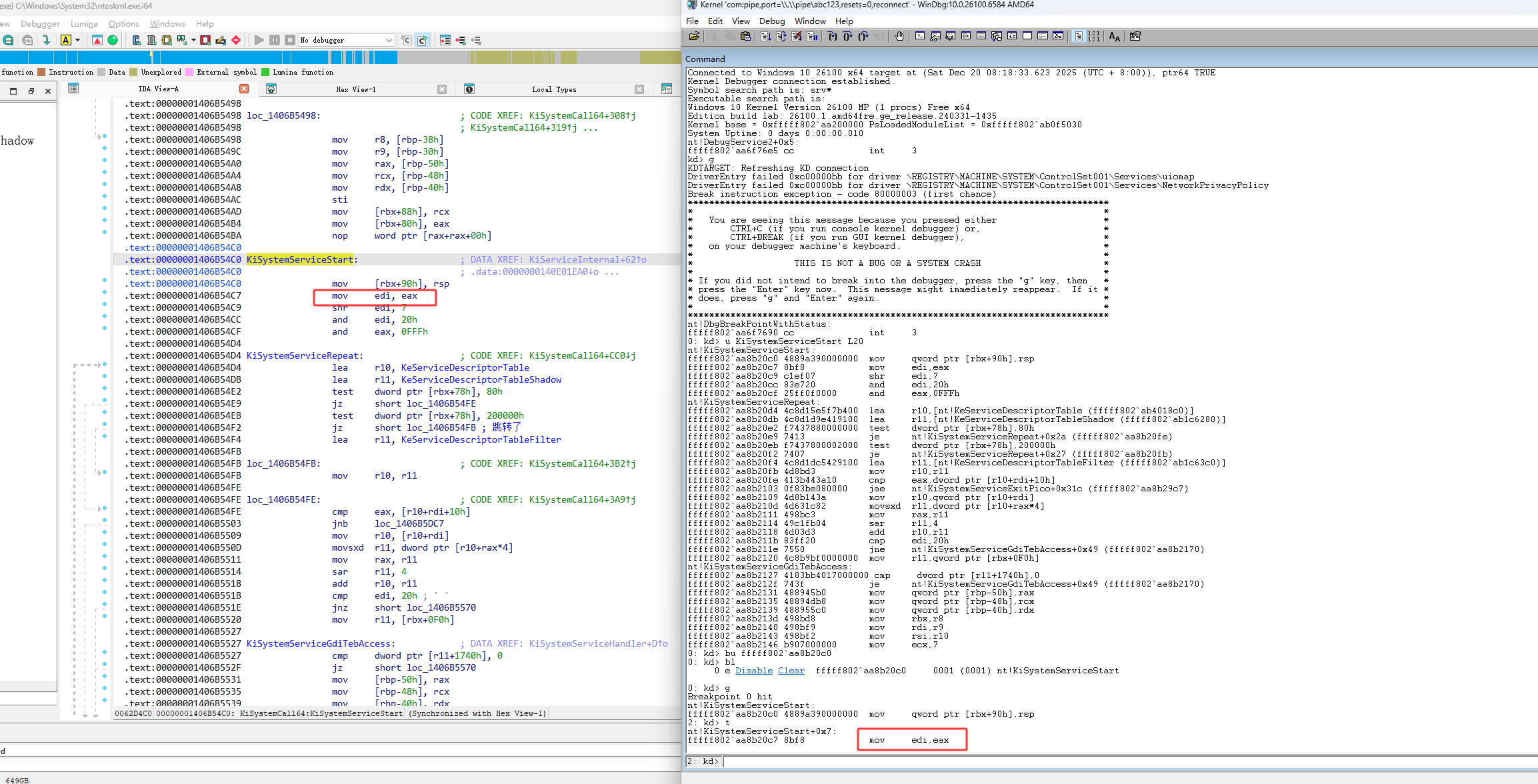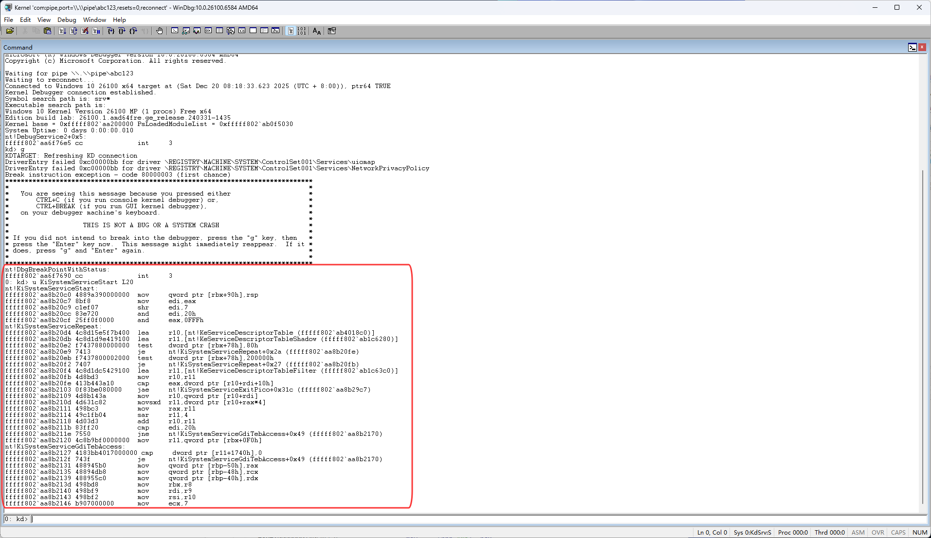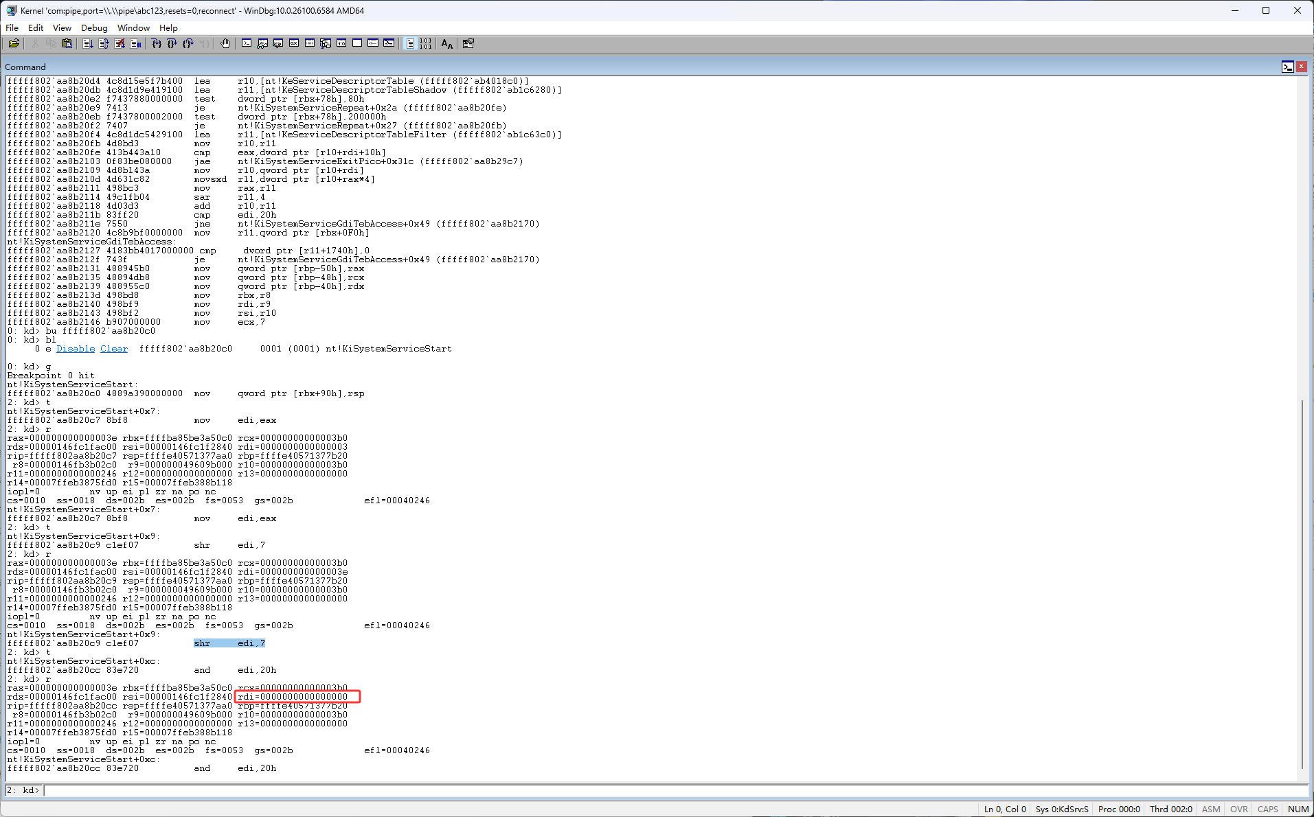 首先使用Windbg来到下图红框的函数,KiSystemServiceStart