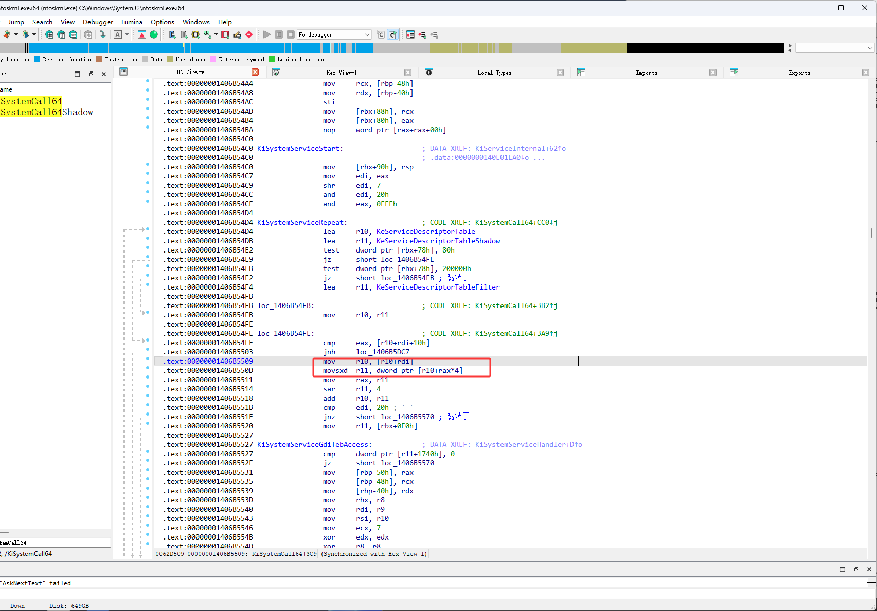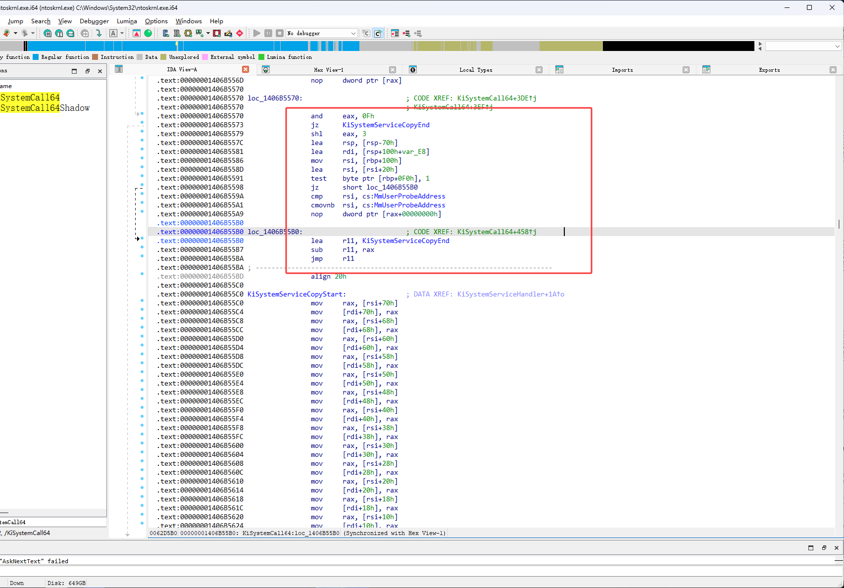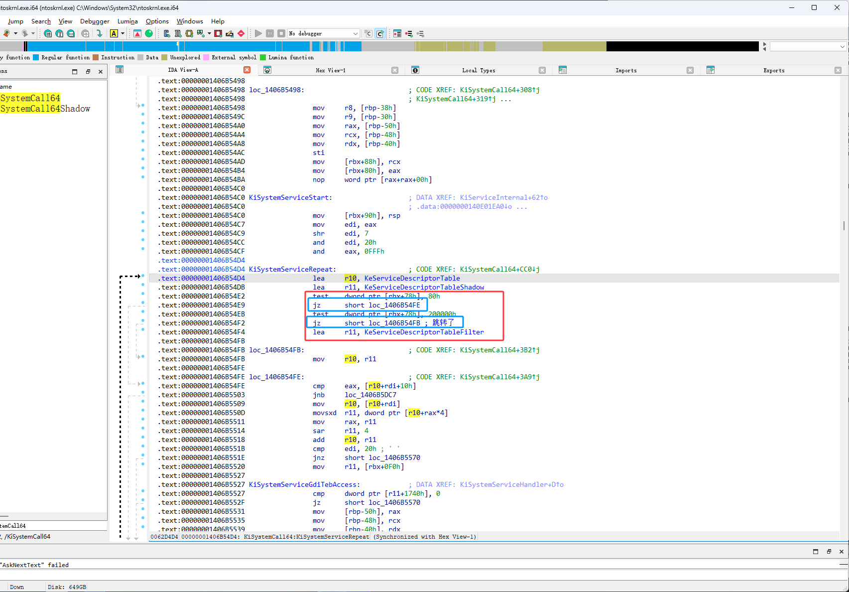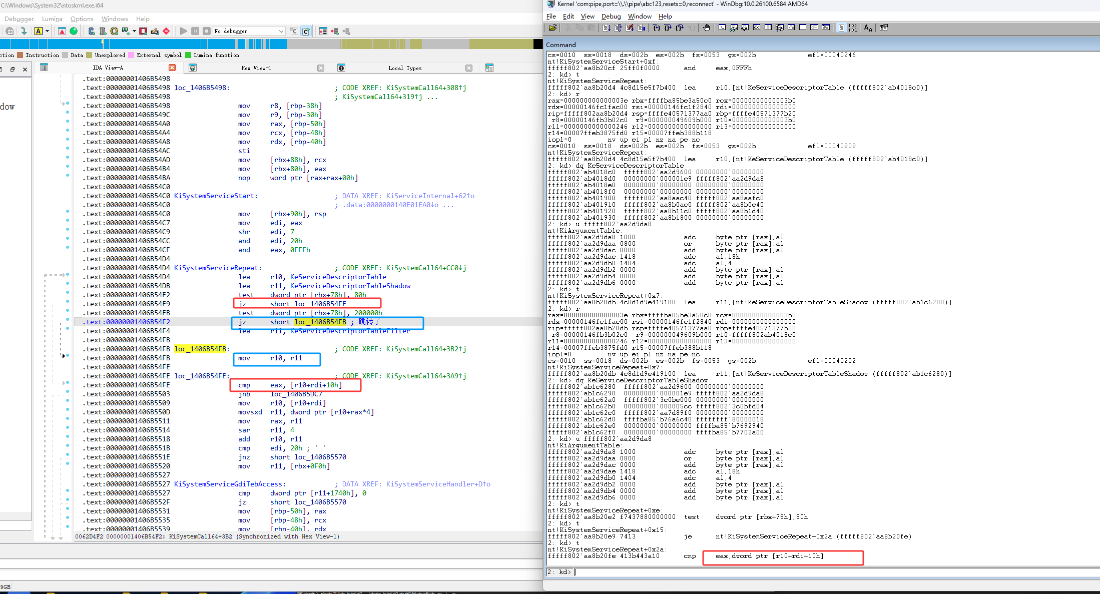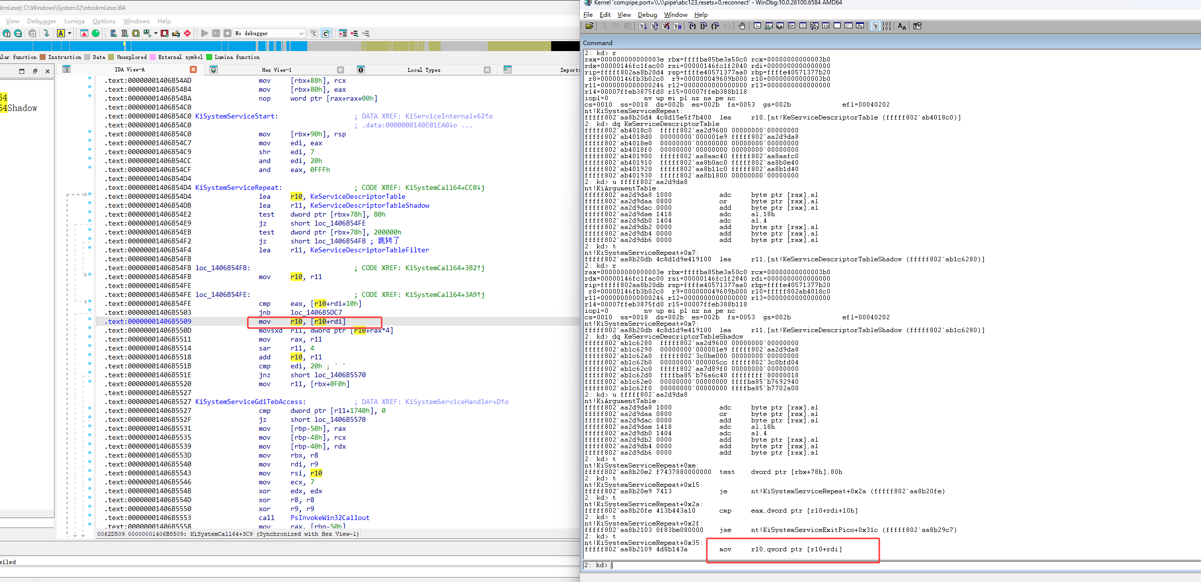 这时它在下图红框位置跳转了,但是之前它是在下图蓝框位置跳转的,下图蓝框的代码是mov r10, r11,也就是让原本是KeServiceDescriptorTable的r10变成了KeServiceDescriptorTableShadow,KeServiceDescriptorTable是早期SSDT表(WindowsPX时代)它里面主要存放了x86的函数用来让最新的系统兼容老驱动,KeServiceDescriptorTableShadow是最新的ssdt表,它里面存放了x64的系统核心函数(内核函数地址)