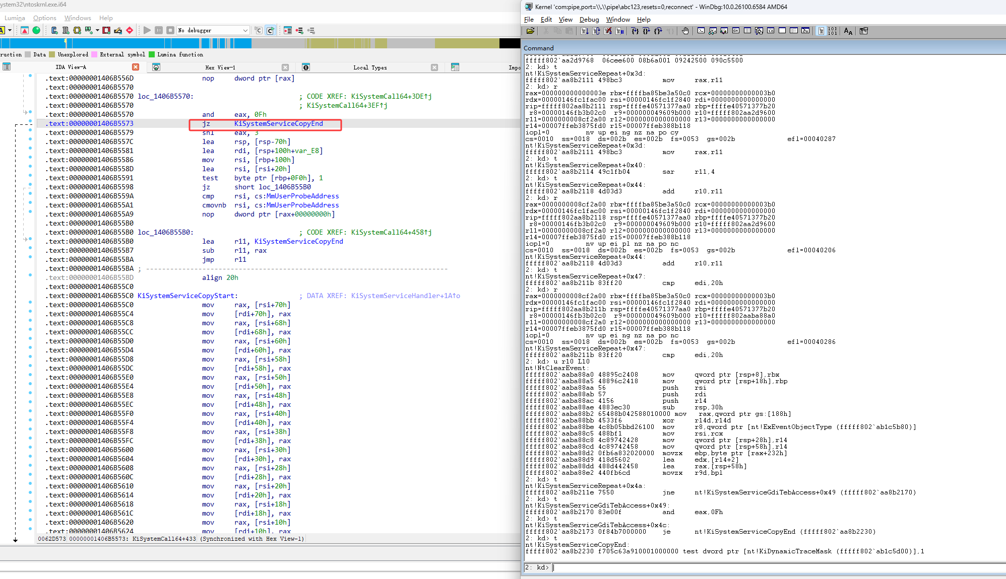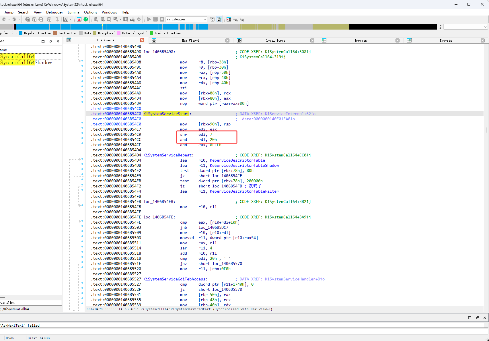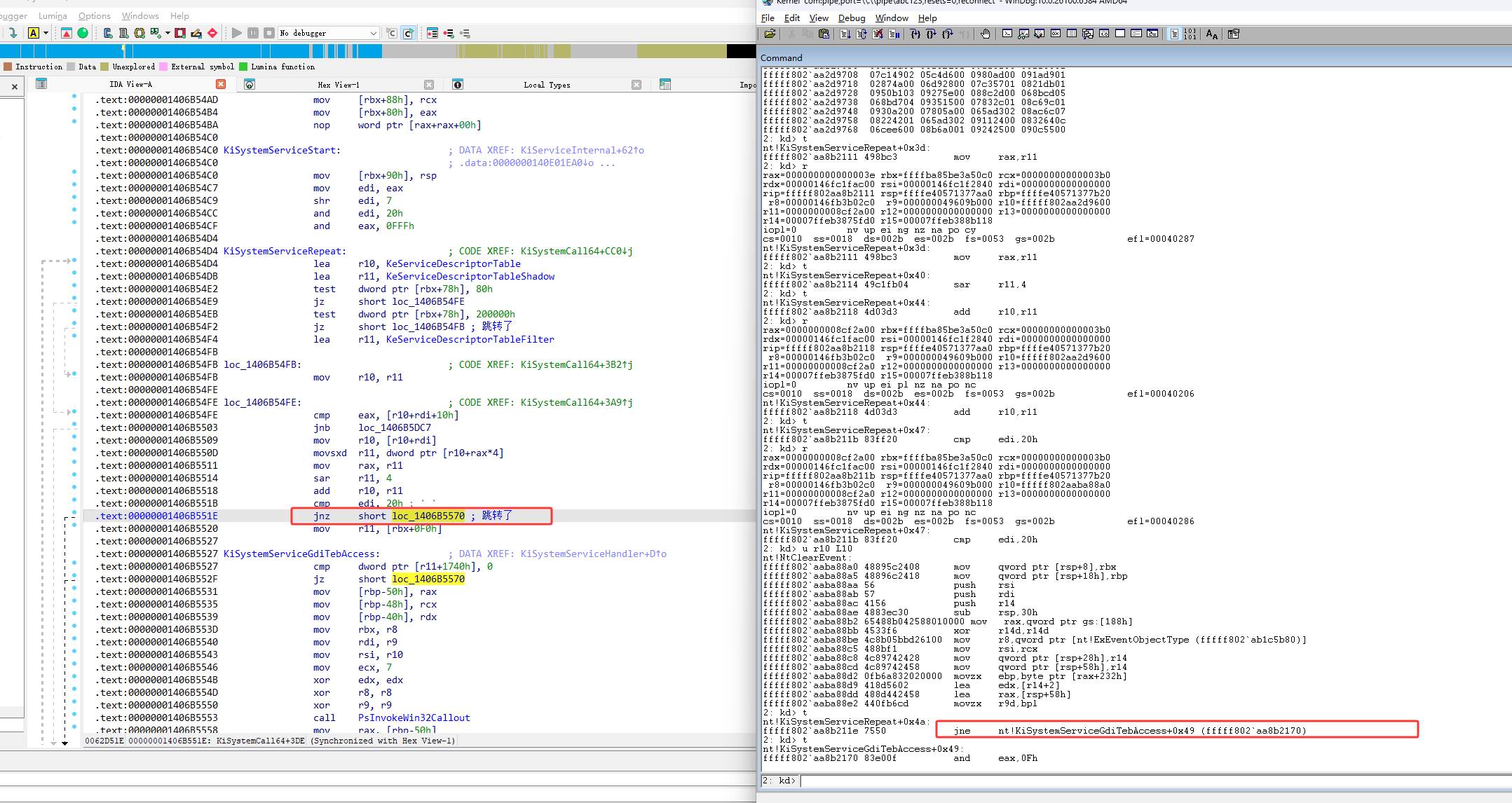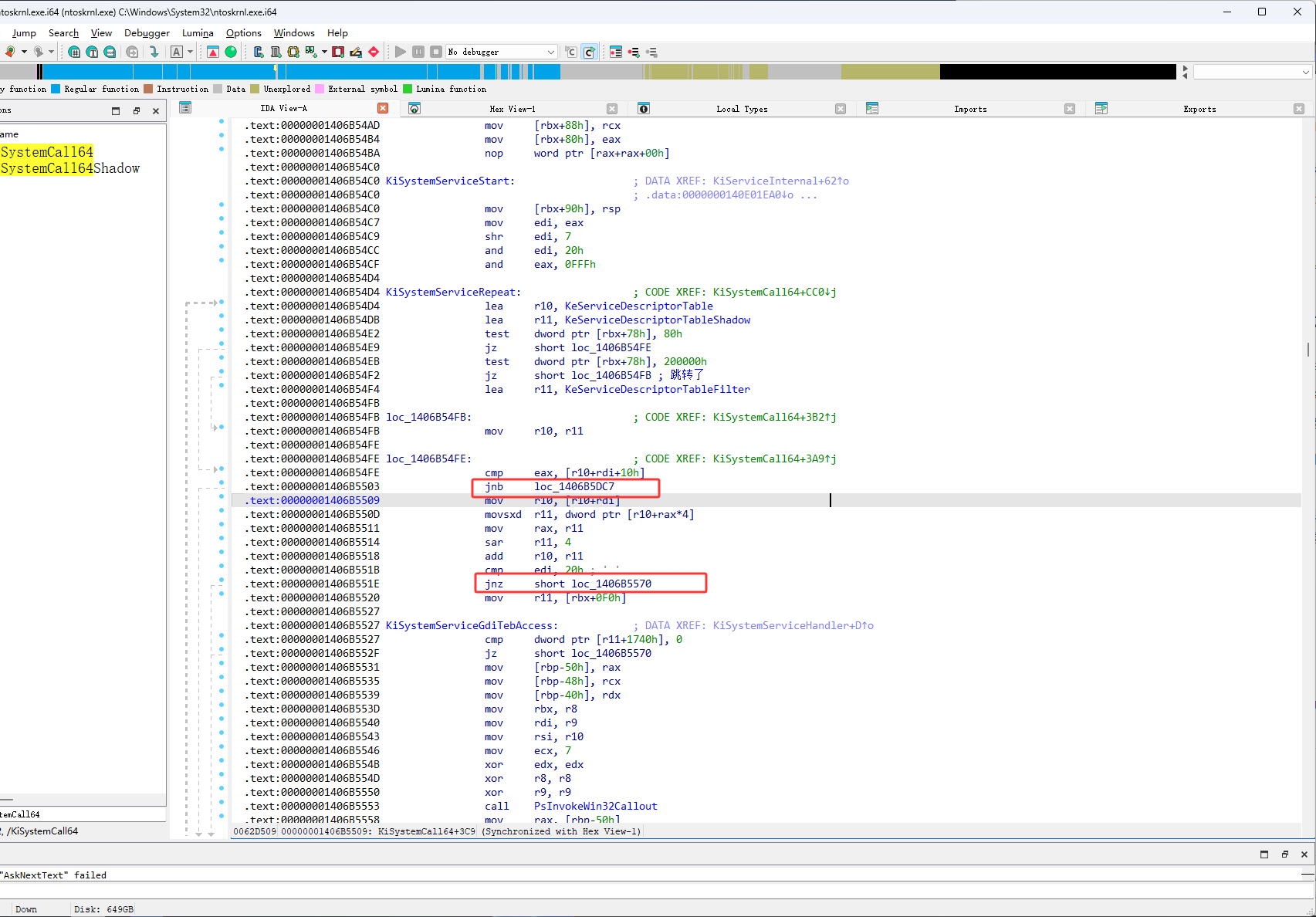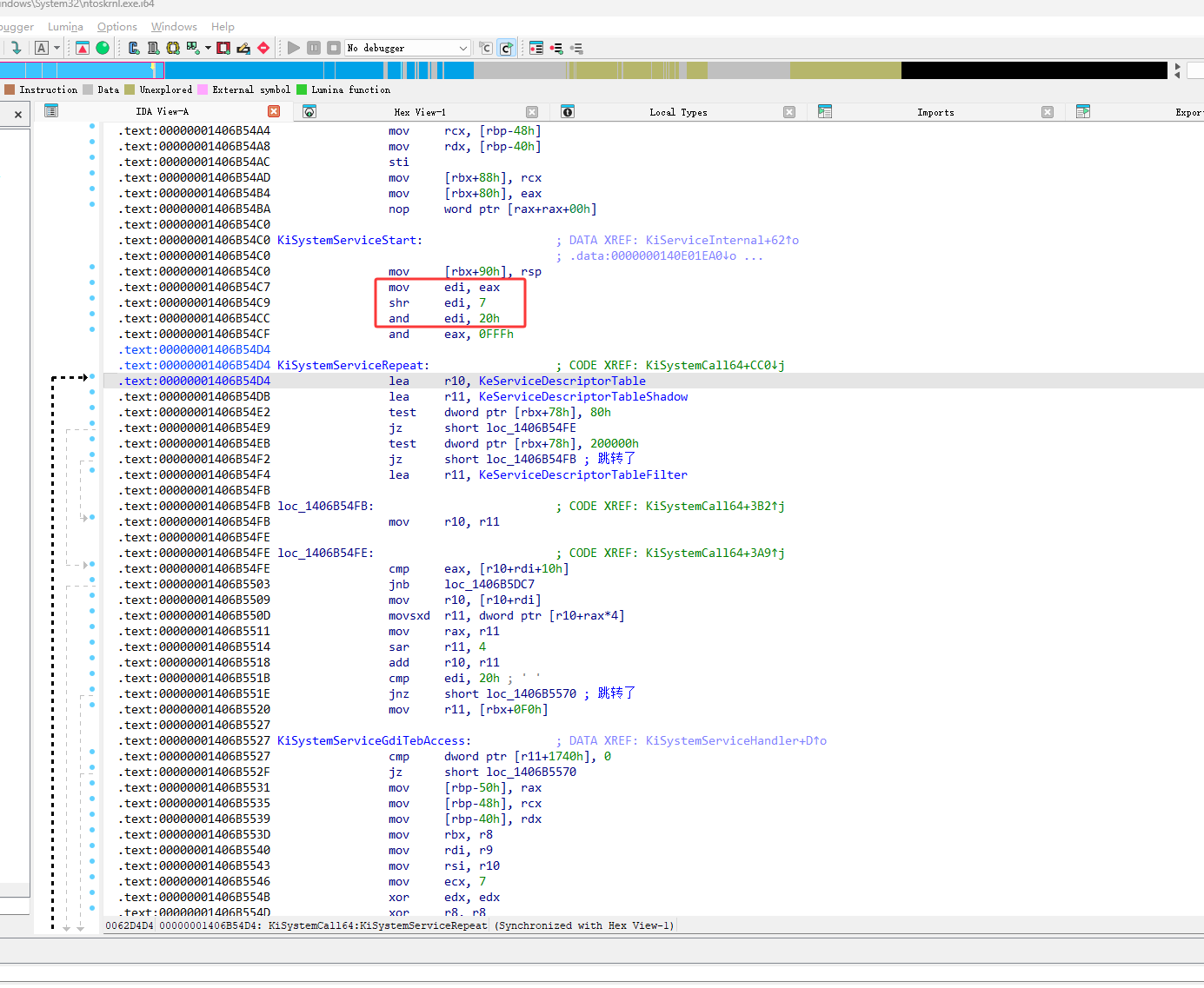 这时它在下图红框位置跳转了,但是之前它是在下图蓝框位置跳转的,下图蓝框的代码是mov r10, r11,也就是让原本是KeServiceDescriptorTable的r10变成了KeServiceDescriptorTableShadow,KeServiceDescriptorTable是早期SSDT表(WindowsPX时代)它里面主要存放了x86的函数用来让最新的系统兼容老驱动,KeServiceDescriptorTableShadow是最新的ssdt表,它里面存放了x64的系统核心函数(内核函数地址)