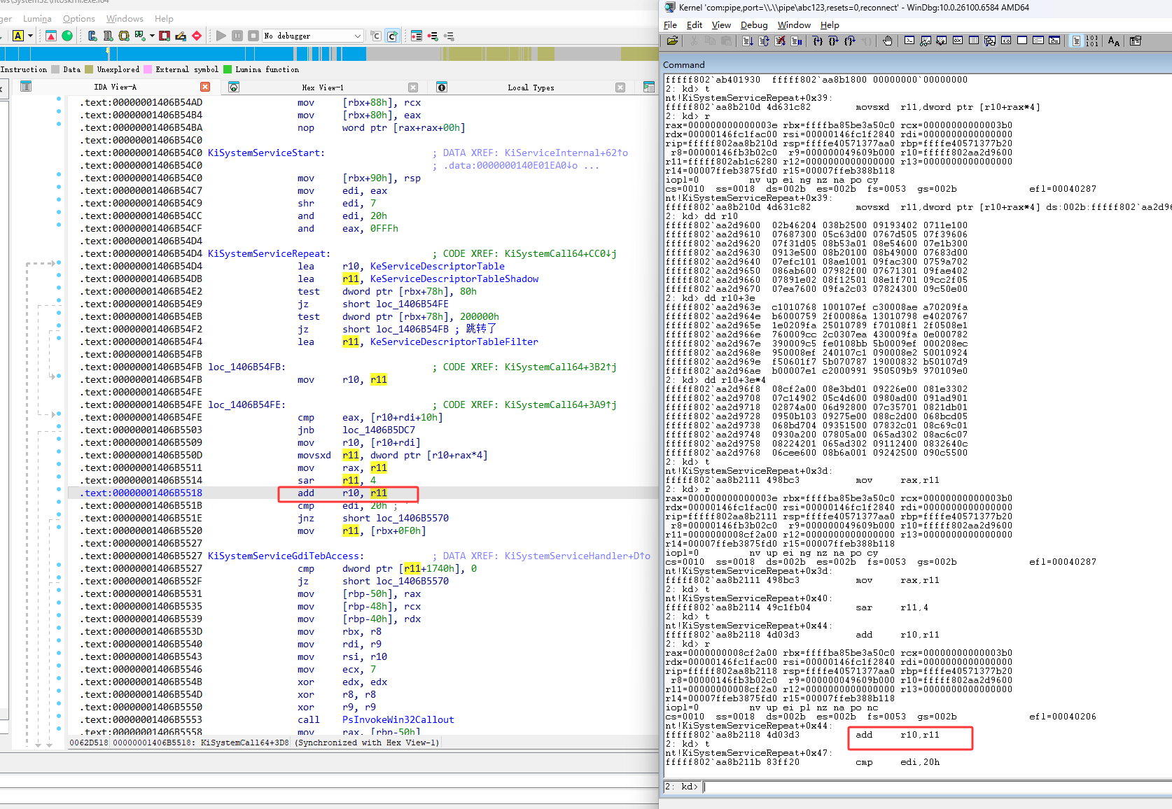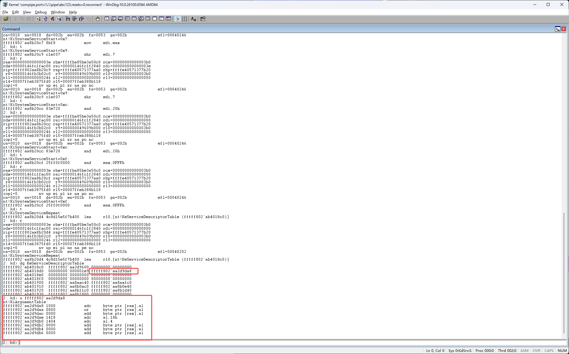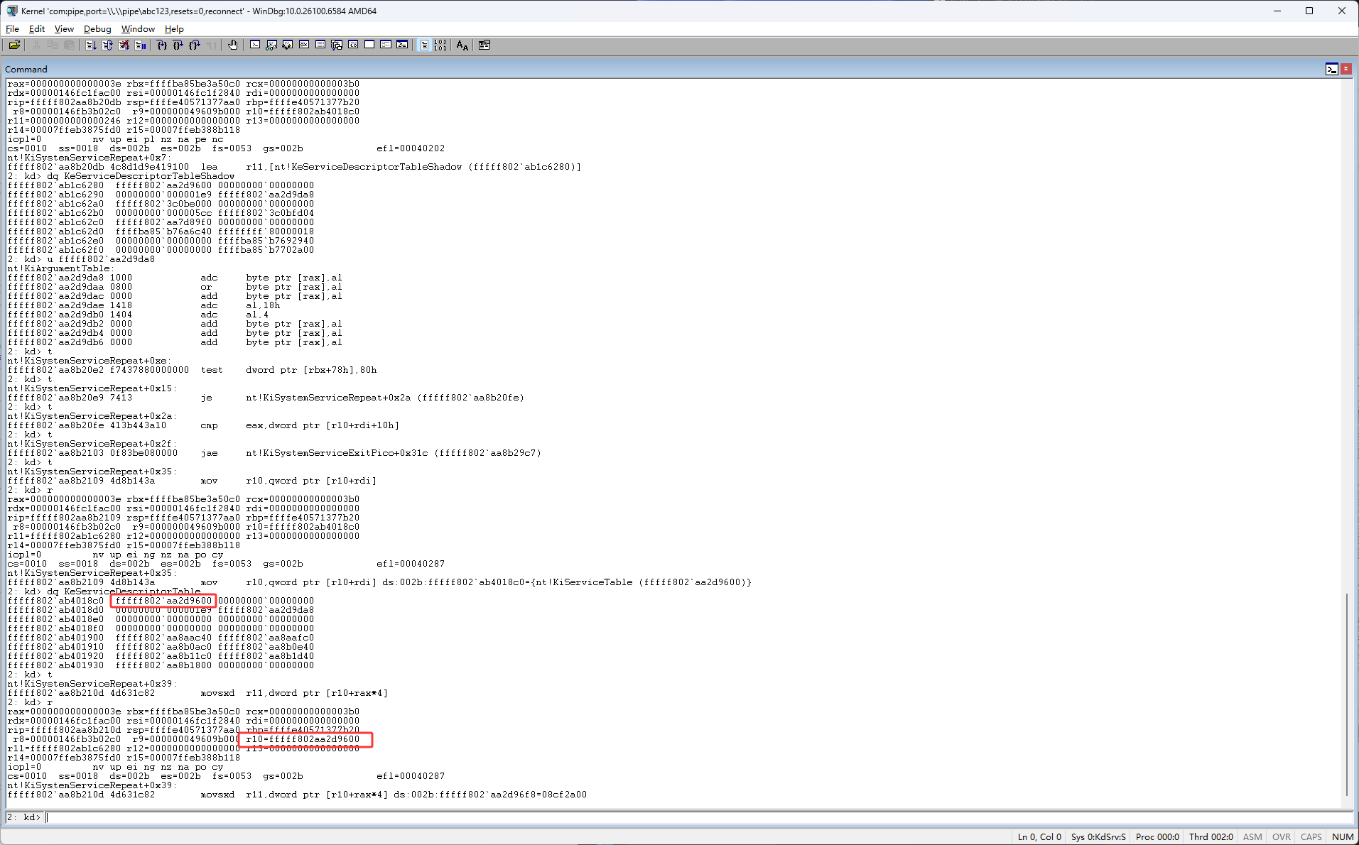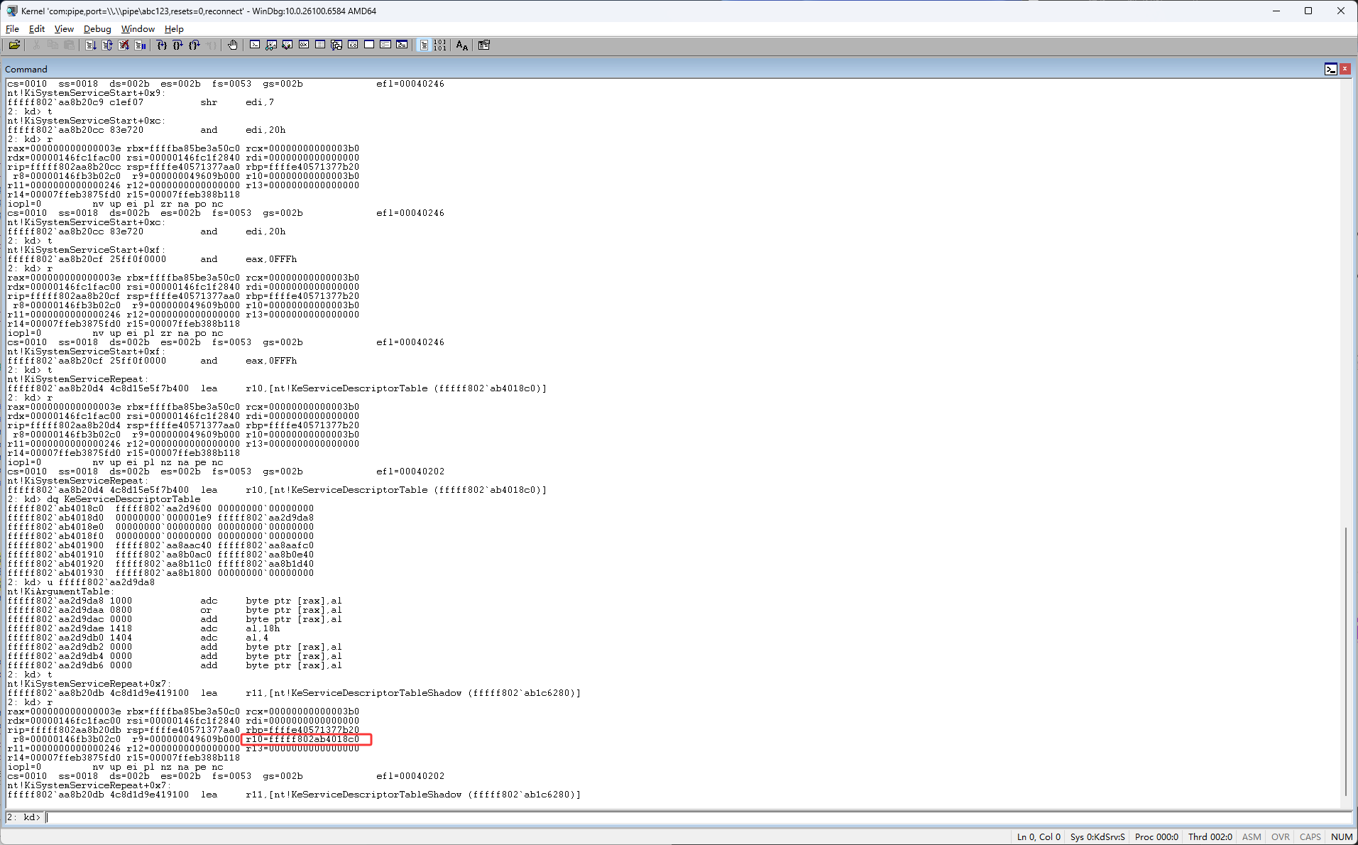 然后接下来继续按F11单步执行,如下图红框这时的r10是KeServiceDescriptorTable