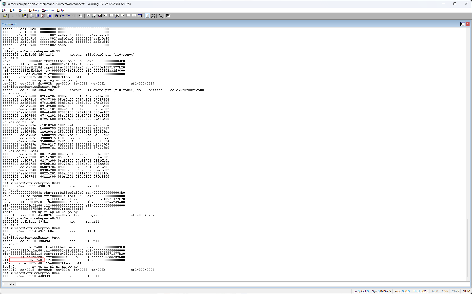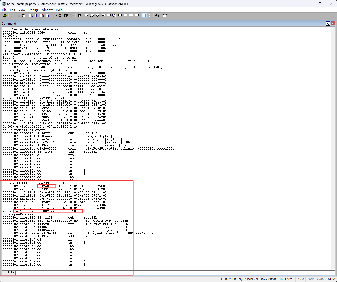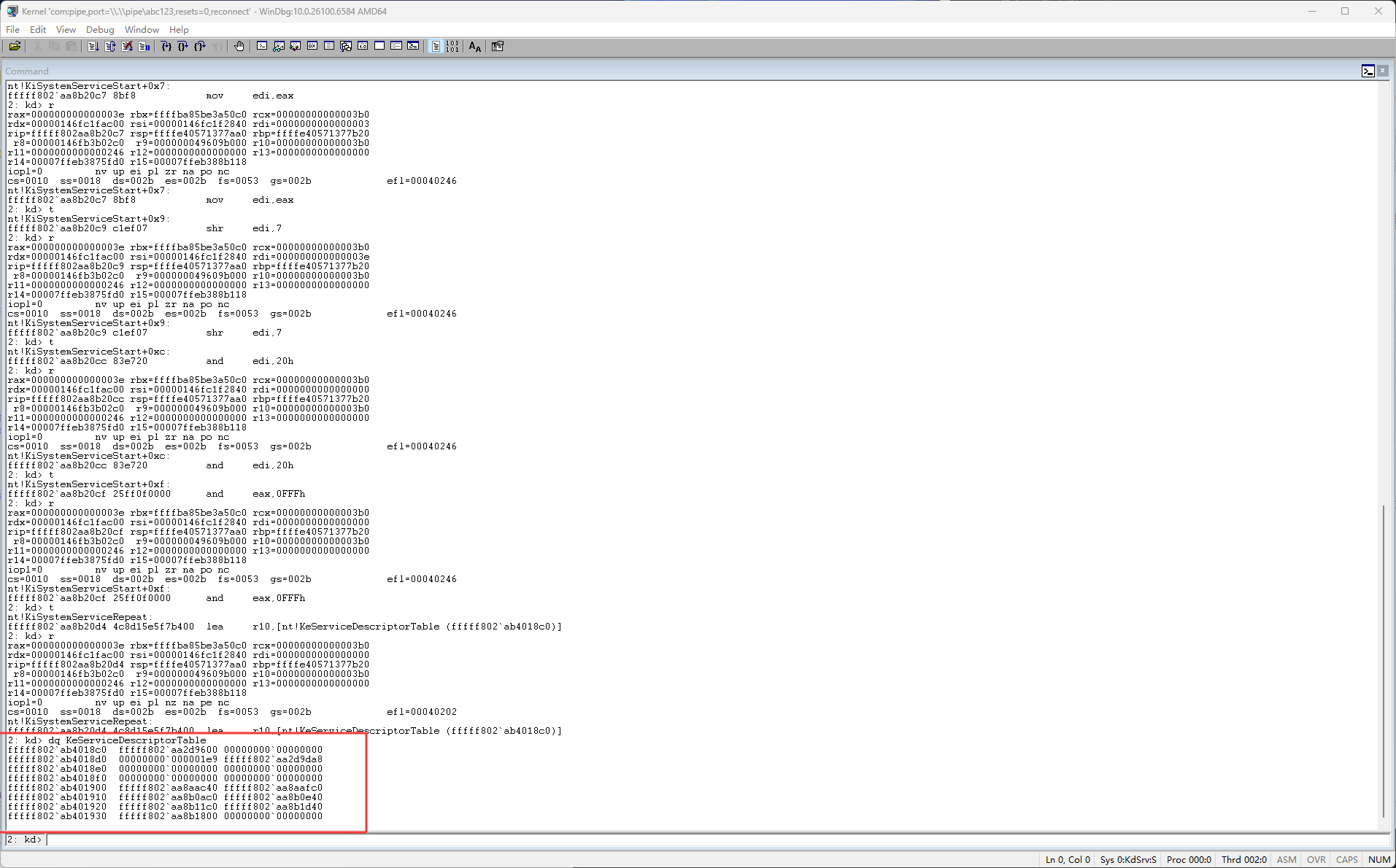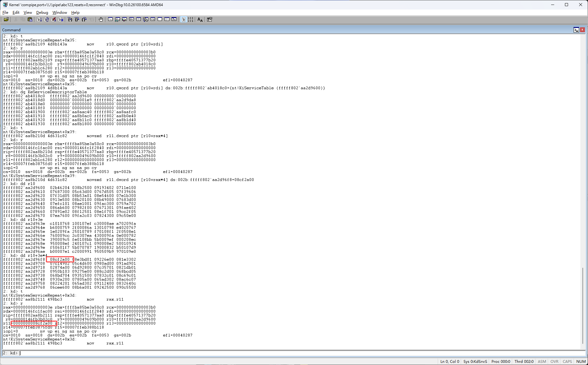 然后接下来继续按F11单步执行,如下图红框这时的r10是KeServiceDescriptorTable