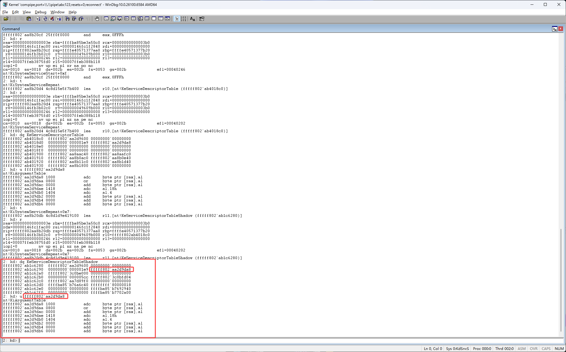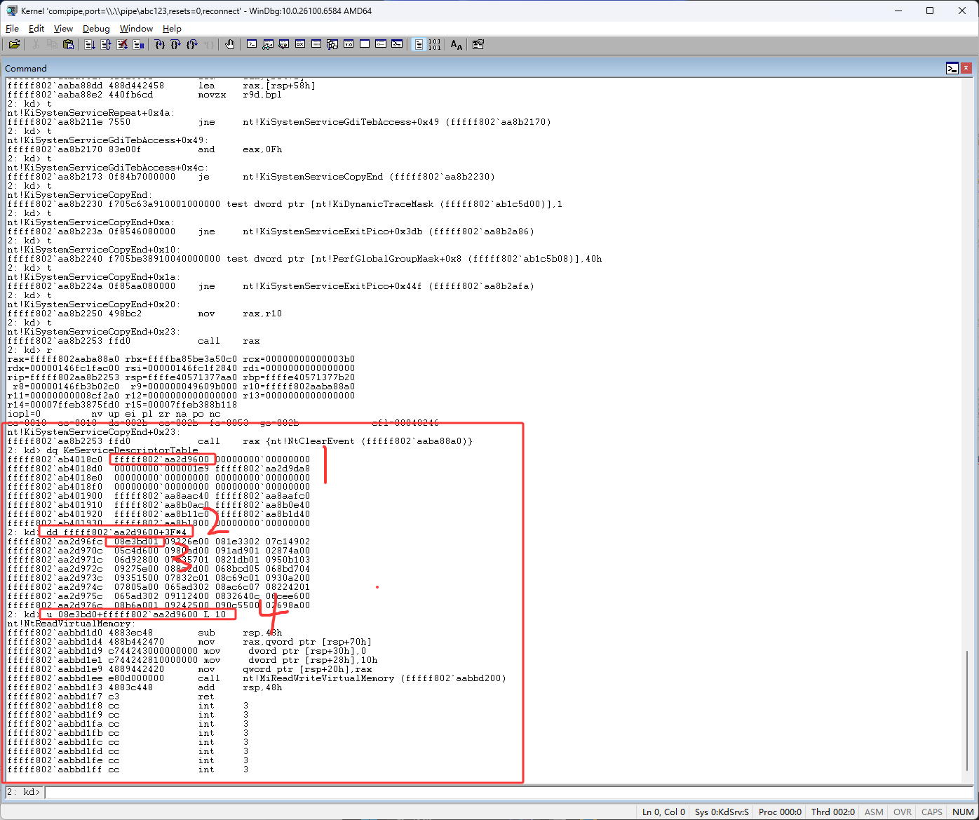 如下图红框KeServiceDescriptorTableShadow的内容,可以看到它和KeServiceDescriptorTable差不多